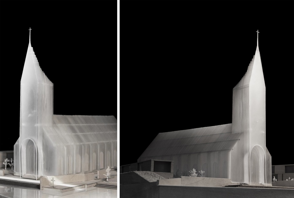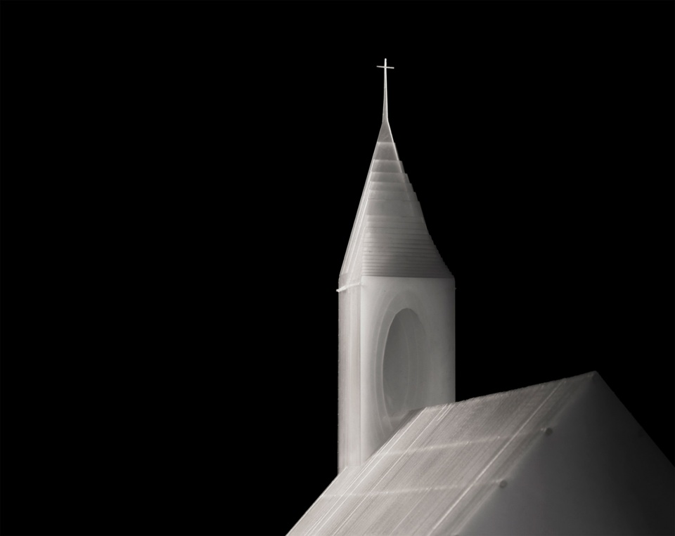 The derived prototype still features the classic components associated with a church, such as the bell tower with spire and rose window, the cascading interior arches, and the Basilica layout, but most of the decorative elements are abstracted – not out of an aversion or rebellion against ornament, but in order to reveal both the interaction of archetype and experiment, and the core issue associated with it: divinity and ritual.