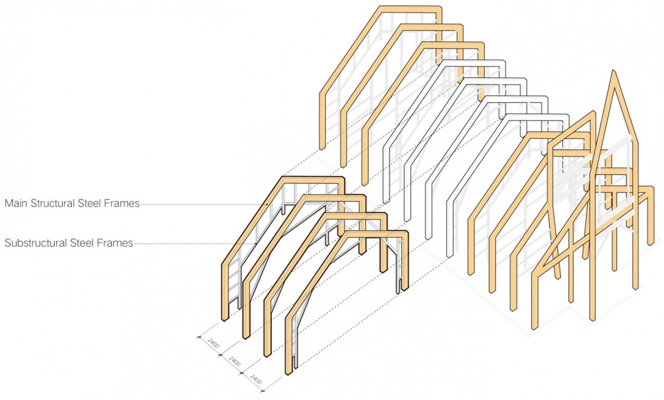 2. 门式钢架由11组主框架,和每组主框架之间的10×6组副框架共同构成。主框架定义了婚礼堂的横向外轮廓,副框架则在龙骨的协助下定义了婚礼堂内部的“洞穴”空间的内部轮廓。两重轮廓也形成了建筑外刚内柔的基本关系。