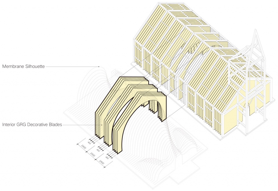 The remaining blades after the substraction of the inner and outer contours allow the building to be softly lit at night, and offering passers-by to feel the sacred light emanating from within. The form is constituted in a unique way: a series of aluminum (outside) and GRG (inside) slices arranged vertically, each 5 cm thick, with a gap of 40 cm between each slice. All these slices are combined to form the entire wall, roof and tower.