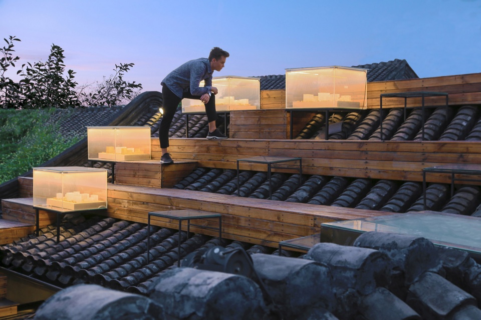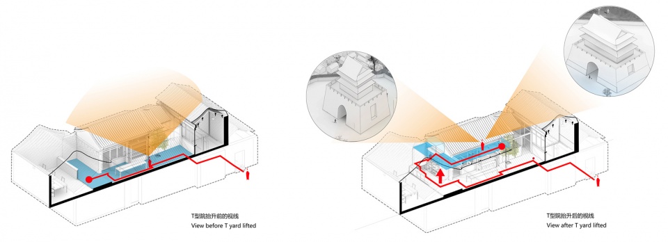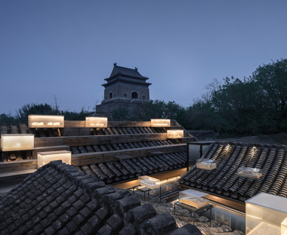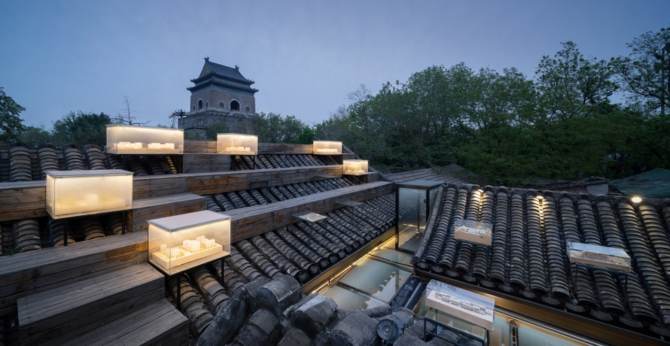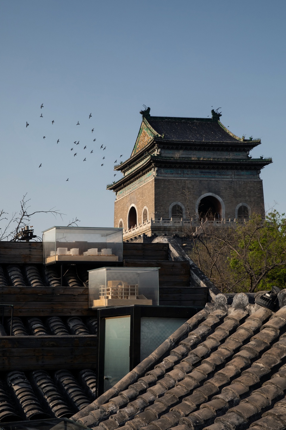 在中国传统建筑中,屋顶形制及体量通常用于区分建筑等级,屋面本身从未被作为使用空间加以利用,仅檐下空间具备其相应功能。院中玻璃体块的加入,将从未被功能化的屋顶空间利用了起来。抬升后,原有老建筑的屋面与使用功能建立直接的联系,人的视野也得到了极大地拓展。钟鼓楼的距离,似乎也随着视线的抬升拉得更近,也更亲切。