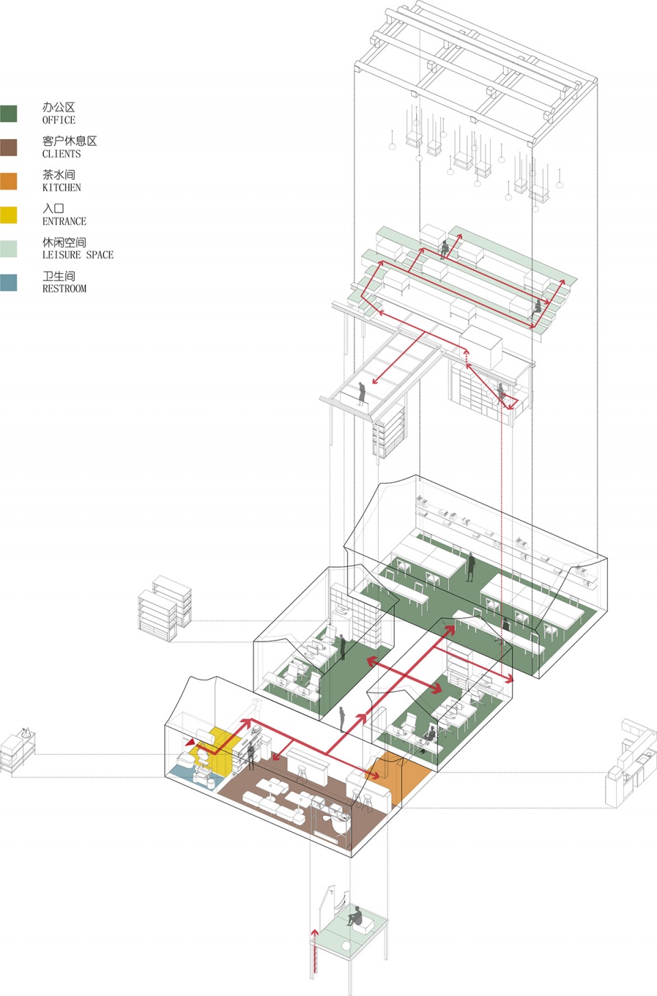 最初的设计目的,是在满足建筑事务所办公需求的同时,创造一种无时效的空间语汇以及对周遭空间文脉特征的引入和吸纳。因此,此次改造的方式被组织成了四个阶段: