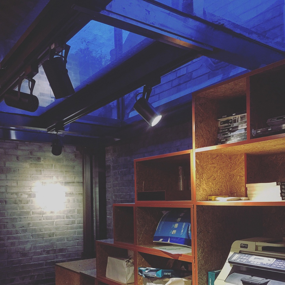 玻璃顶下原有的庭院,变成串联起三个办公空间的共享展示区域,东北角增设一个了综合书柜同时充当了通向屋顶平台的楼梯。由于胡同条件限制,室外机被巧妙集中在工字院西北角的半透明的光井之中,配以人工绿植及磨砂玻璃,反而成为新的视线焦点。