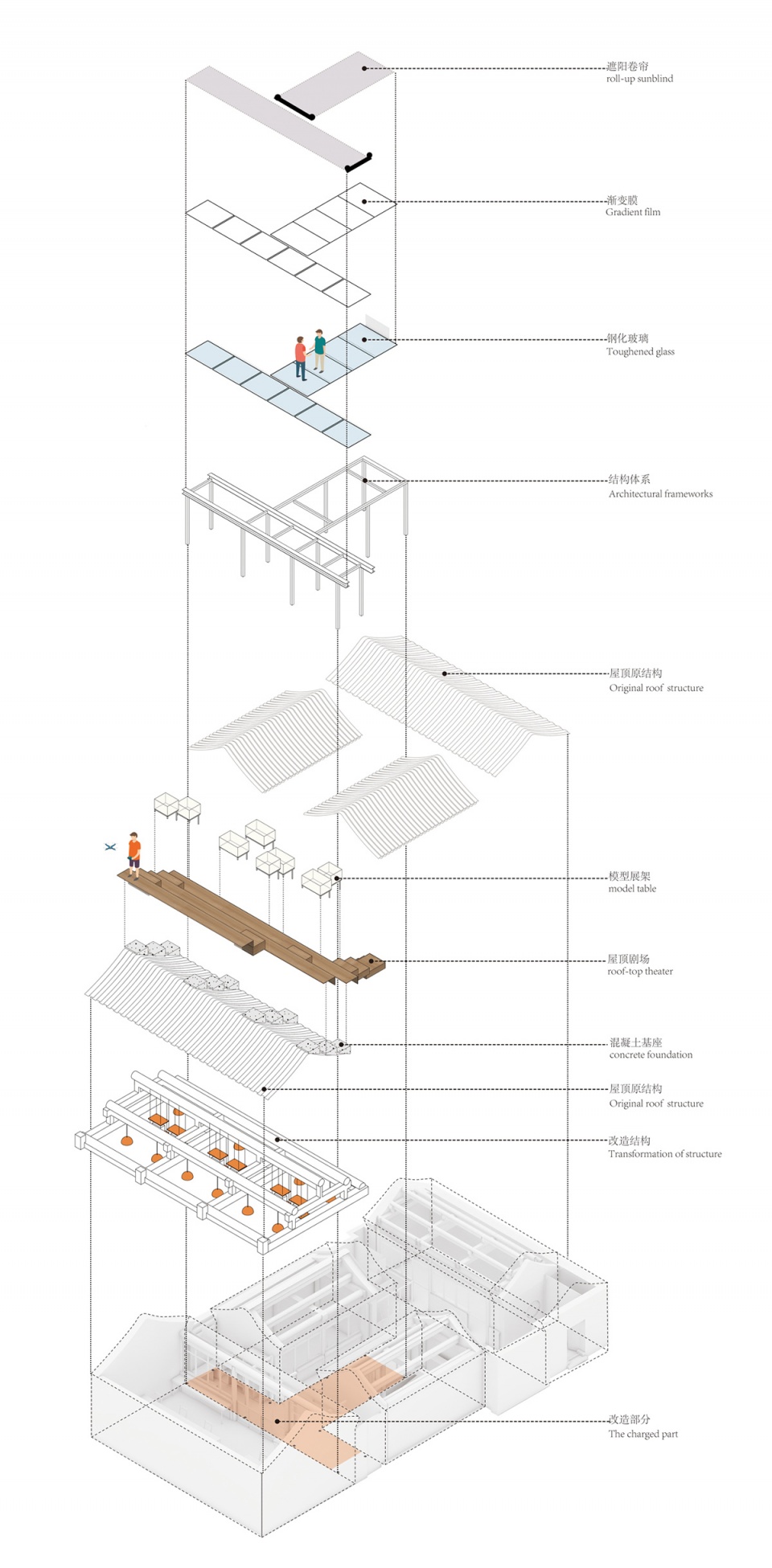 二期改造中,屋顶被做成更永久性的状态,在建筑现有的椽子的部分进行了加固并搭建了龙骨,形成了阶梯的状态,与传统的屋面的互动自此呈现出一个量变到质变的过程,和人的行为直接连接起来。