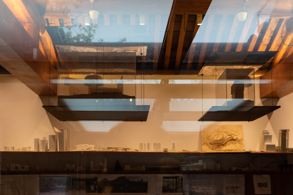 工作室的建筑模型,被置入一个个玻璃灯箱中,打破了阶梯的横向元素,也点亮了屋顶的公共空间。屋顶下的挑高空间也被充分利用,入驻时的石膏吊顶被拆除后,原有木构形式被再次打开,上层空间被若干个箱体及反射面所占据,作为模型展示之用,与外露的建筑结构相得益彰,同时也潜在传递出以建构文化为先导的设计理念。