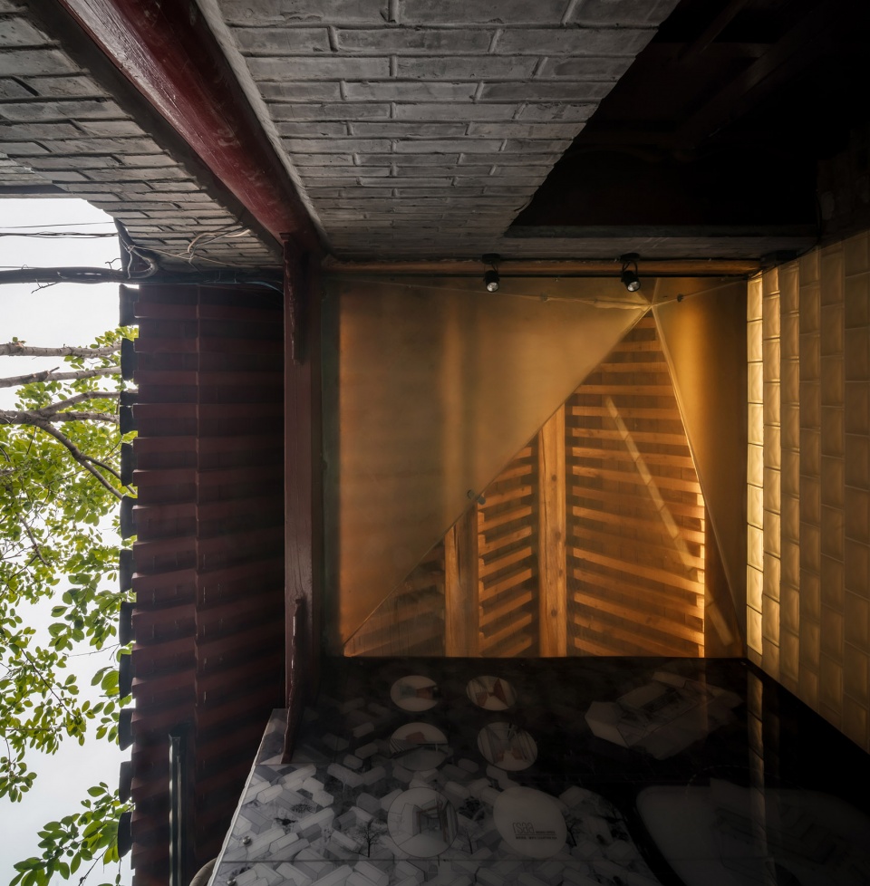The architectural models of the studio are on display in lightboxes that break the horizontal lines of the modifications. The resulting landscape offers a communal space to seek inspiration, surrounded by the studios past as well as Beijing’s history. Below the roof the original wooden construction of the roof is further exposed and made visually accessible.