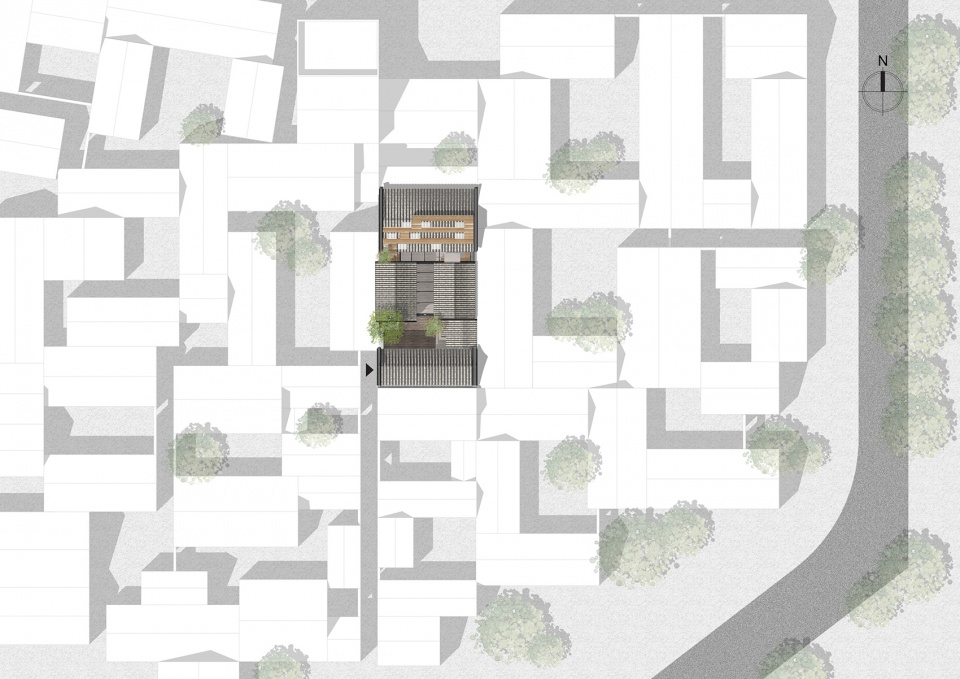 The top of the box now forms a “T-shaped platform” for public activities on the roof, while the open patio in front of the southern room is preserved. The identity giving persimmons on the trees become readily available and can now be plucked without a ladder.
