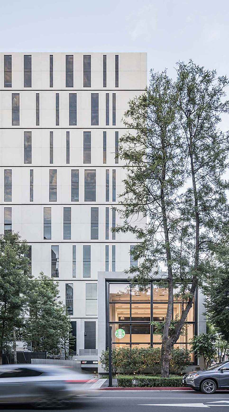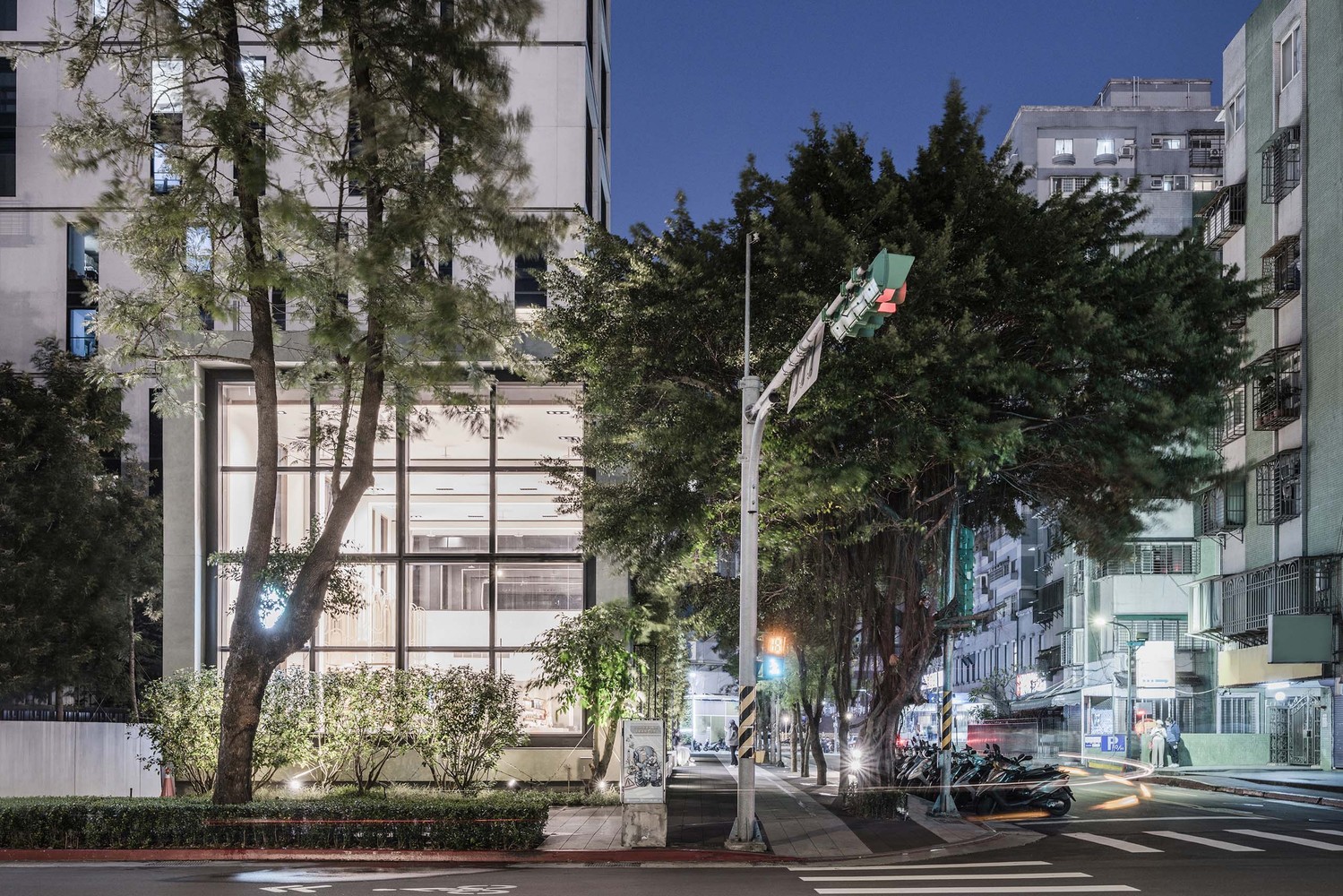 建筑主体自基地北侧退缩 13 米,提供开放式的景观绿意公共空间,并植回开发前基地内的原生树木;而南北侧的钢构雨棚围合塑造室外景观与主建物之间的过渡空间。