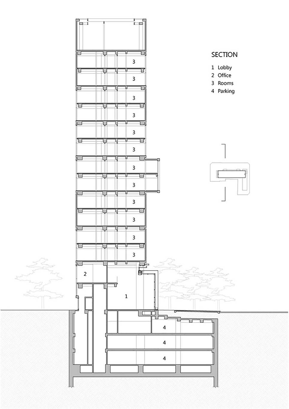 Natural light is introduced through vertical openings of different widths in the long facade, while large square windows are used in the short facade on the east and west sides. The open and closed alternative window forms create a lively facade rhythm, which is one of the few hotel buildings with architectural imagination.