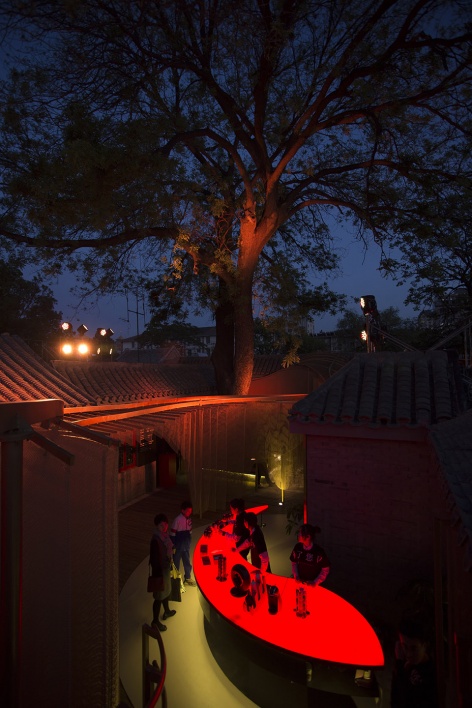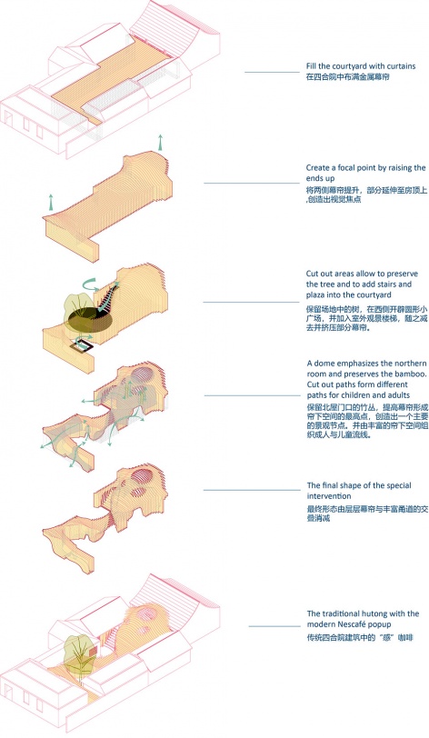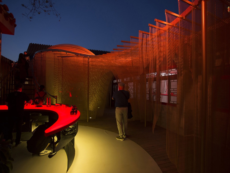 Beijing is remolded here. Siheyuan (traditional Chinese courtyard in Beijing) is a spatial metaphor of the city, as urban movements flow through the golden drapes and soft spaces in the courtyard, boundaries are broken here.