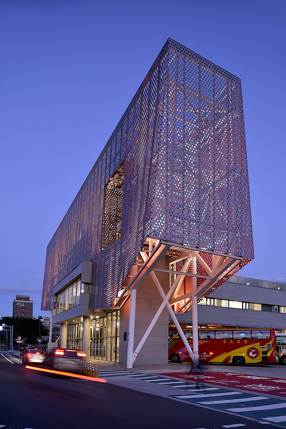 上方“招牌”造型则是以空体钢构构成,其外覆冲孔铝板。在白天,此巨型招牌主要显示出金属质感的银灰色,而在夜间,冲孔铝板内部的鲜红色藉由灯光露出,形成都市中新颖活泼力的辨识性。