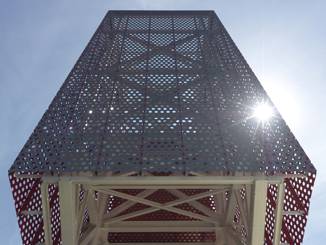 The upper "signboard" shape is composed of hollow steel structure, which is covered with perforated aluminum plate. In the daytime, this giant signboard mainly displays the silver gray of metal texture, while at night, the bright red inside the perforated aluminum plate is exposed by the light, forming a new and lively identification in the city.
