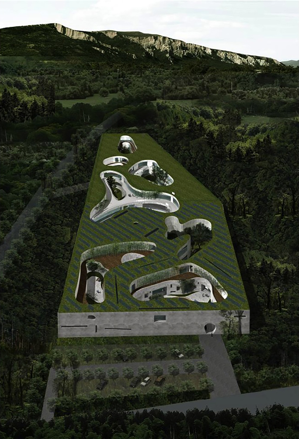 项目位于龙庆峡燕山山脉脚下,主要功能由道观及道家养生中心两部分组成。设计从道家“一”的思想出发将建筑视为一个浑然的整体,从老子的“凿户牖以为室,当其无”出发在整体上开凿 出庭院与空间来,此过程犹如一生万物。而庭院的形式产生则选择具有象形特征的古汉字“道”作为形式来源,通过水流冲刷获得一种具有偶发性的形式,这一实验性策略则体现了“无为”的思想,即顺其自然。建筑形体由基地形状生成,外表简肃而内部丰富,形成内向性的园林式建筑,可称之为“有内而无外”,与道家注重内在的理念相合。