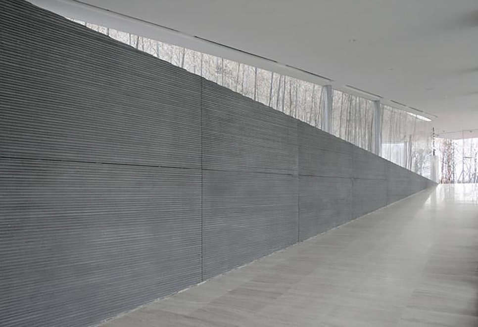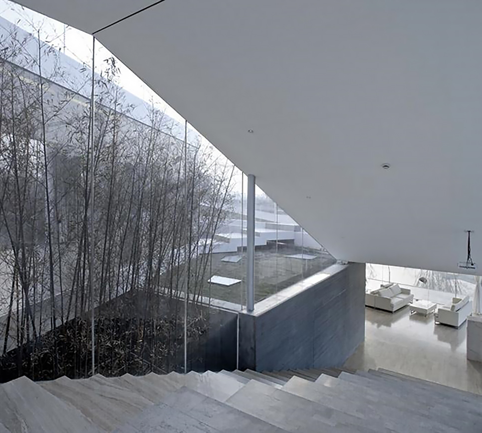 在构造层面,将楼板、柱等建筑构件的尺寸控制到最小,以加强其轻盈的特征,使建筑漂浮于环境中。在材料上建筑采用超白玻璃,白色铝板,洞石地面,清水混凝土挂板,以及室内半透明夹丝玻璃隔断等材料,以加强简洁和纯粹的氛围,达到建筑形式上一种非物质化的抽象。在缺少具有地域性的材料和建造方式的外部条件下,抽象的形式也成为一种自然的美学选择。