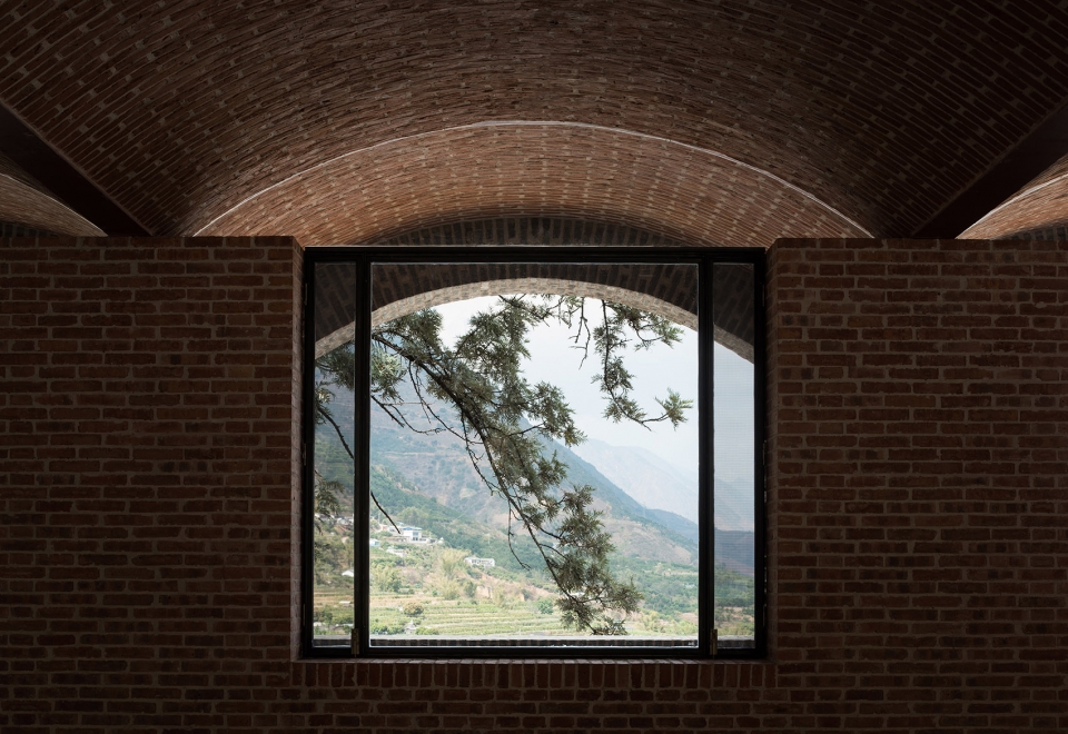 The main building is located at the north side of the plateau, one-storey lower than the central courtyard. The coffee storage space is located at the bottom level, and cross vaults create a cellar-like space shrouded in heaviness and dimness. Such heavy volume simultaneously responds to the physical requirement of a constant temperature and humidity. The coffee processing area is located at the mid level and requires large space for roasting and packaging. It combines long-span steel beams and one-way brick vaults to obtain a continuous open space, while bringing in views from the courtyards and the valley. Its side corridors allow visitors to walk around and do sightseeing. On the top level, concrete frame takes over brick to achieve maximum transparency, meeting the programmatic needs of hotel rooms overlooking the valley. From the bottom to the top, there is also a gradual transition from heaviness to lightness, responding to diverse needs from storage, processing to views.