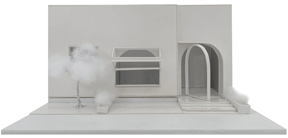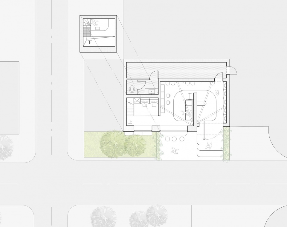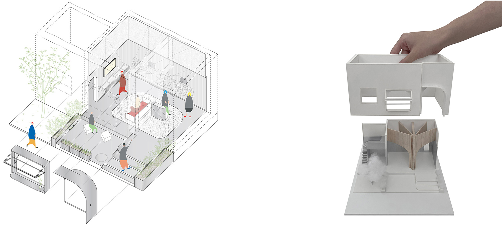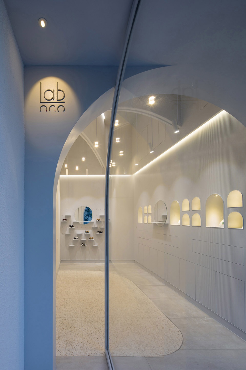 一开始我们对委托方提出的东方文化意象(O.C.O意为OF CHINESE ORIGIN),感觉很难把握;加之我们平时穿衣服也模胡,离时尚很远。频繁沟通之后,大家的关注焦点共同稳定在了如何与社区融合衔接上。Lab O.C.O是一个“展”的空间,而讨论主要集中在“用”上,如何解决小尺度的展示空间在流线、分区、陈列、储藏和公共活动等方面的需求,而形做着做着就落出来了。券门一开始不在,或者说没这么具象,最后使用方式与形式语言相遇的时候,设计就定了下来。