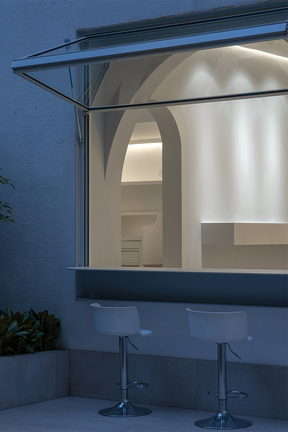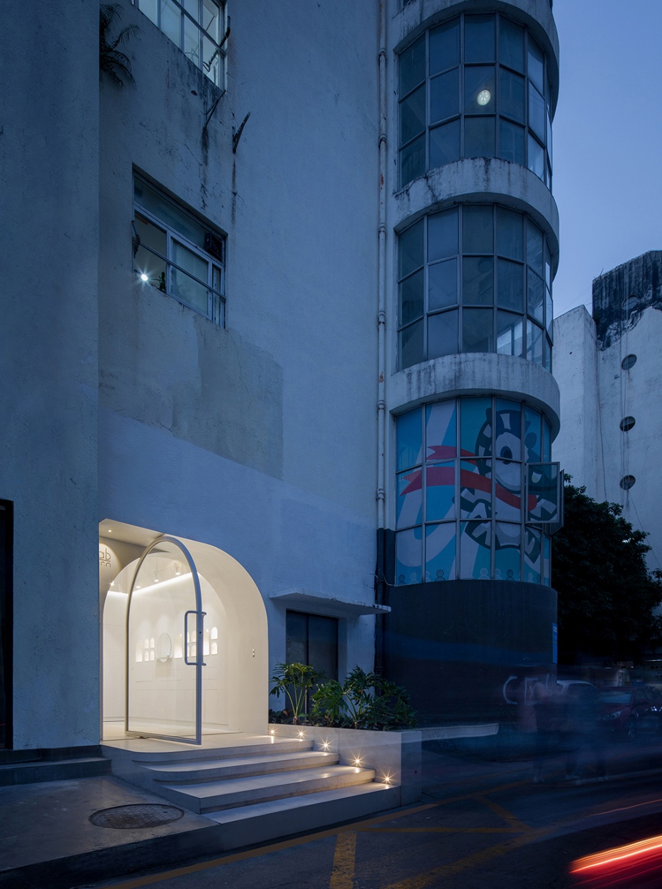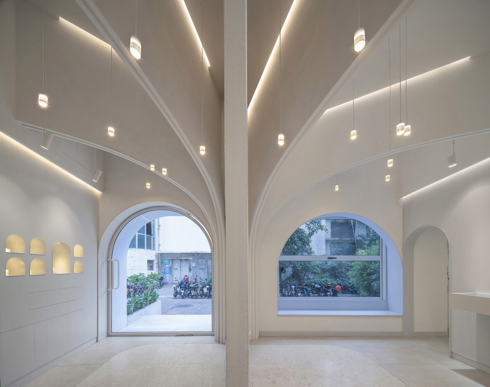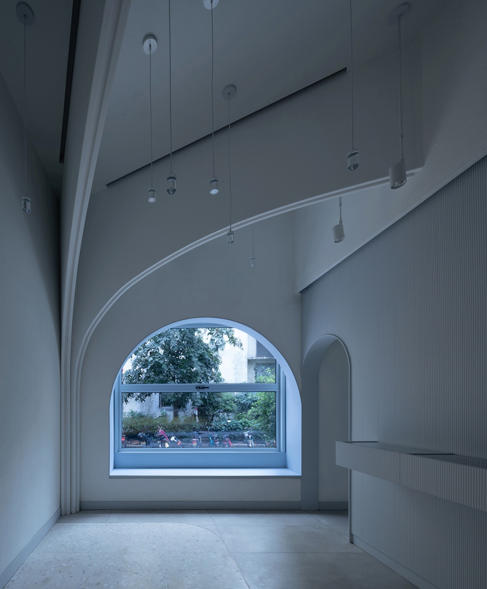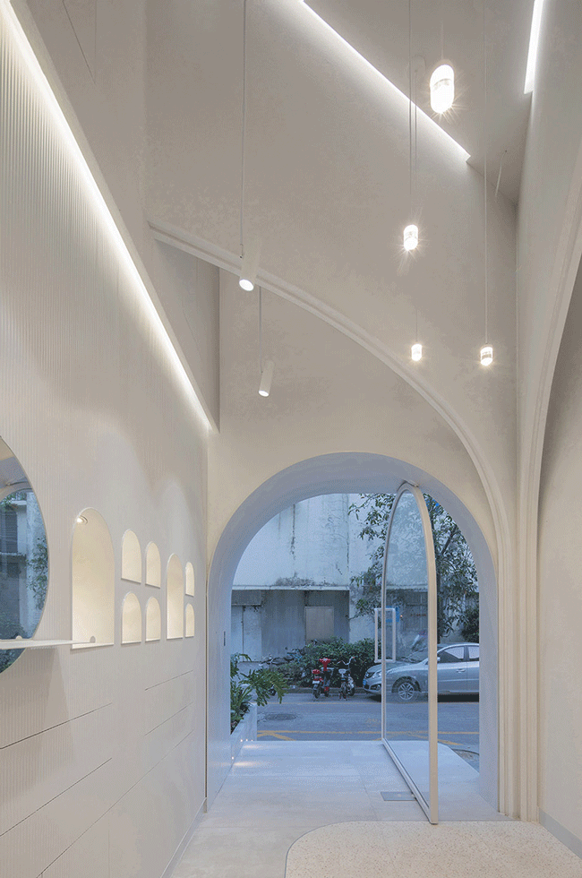 In order to make the space open and transparent, we discussed with the construction crew to hide the frames, bearings and locks to the greatest extent, so as to provide almost undisturbed indoor view for the street. At the same time, the lively street scenes are included in the gallery. The final entrance is a 3*3 undivided glass revolving door. The arch door and its eccentric rotation axis posed challenges to construction and security. The approach of the final entrance enlarges the site, with passengers often stepping back to look at it fully before going forward.