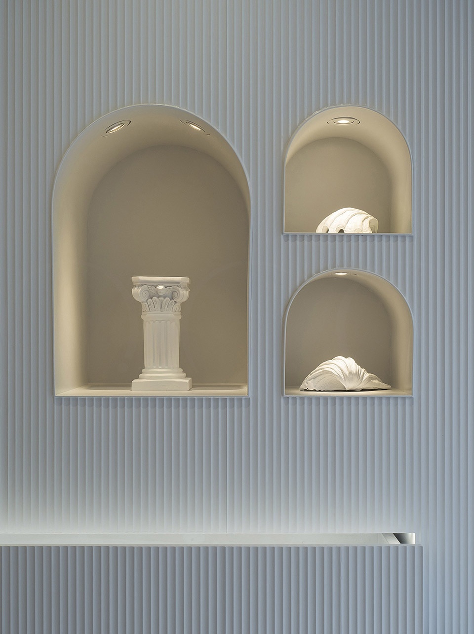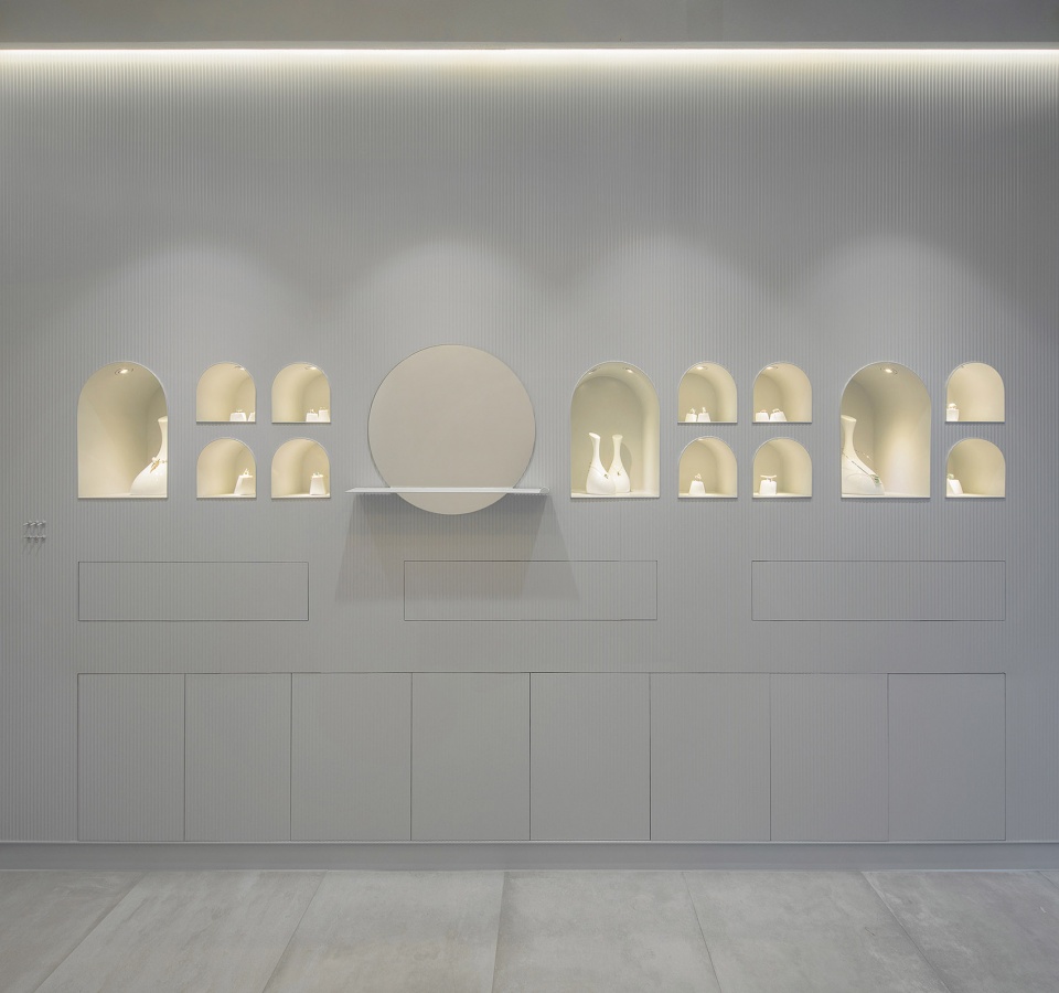 The main material was subconsciously decided to be the water-grain aluminum plate, as response to the arch language. The main body of display slightly protruded out of the wall, for the finish of aluminum plate cut and the addition of texture and order. Each pallet in the detachable display area can be disassembled and replaced, forming different combination of light and shadow.