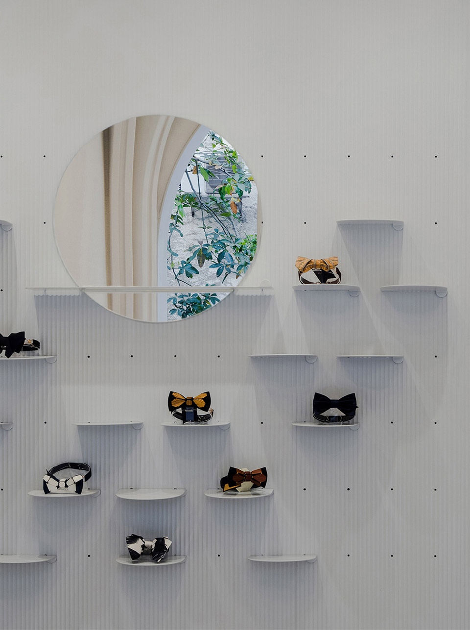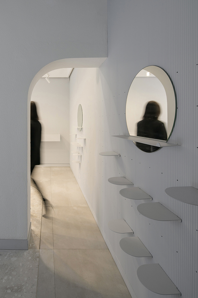 项目很小但一直处于一种演化的状态,由于两个街铺租约时间差,导致从选址到一期再到二期,前后陆续快三年。期间不乏大小调整,家具展品也陆续添置替换。一期时候也考虑到二期拓展的不确定性,扇形平面布局提供了弹性,从一期摆荡到二期,我们觉得它像钟表的指针,也含着时间的意思。