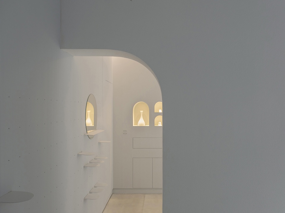 The space was narrow but the floor height was close to 5 meters, which raised the line of sight. While the initial design considered the full use of height, we later found that this was problematic: the space needs to focus on the height of the exhibits. Therefore, we use the display layout, material division, lighting, arch/tree shape and other methods to “press it down”, minimizing the towering feeling and creating the richness of the display area through changing lighting.