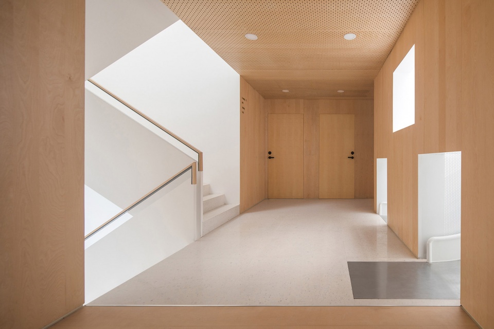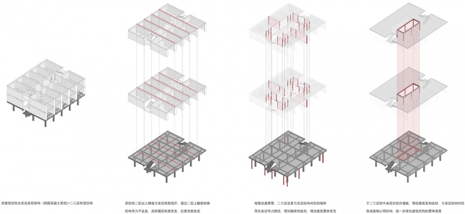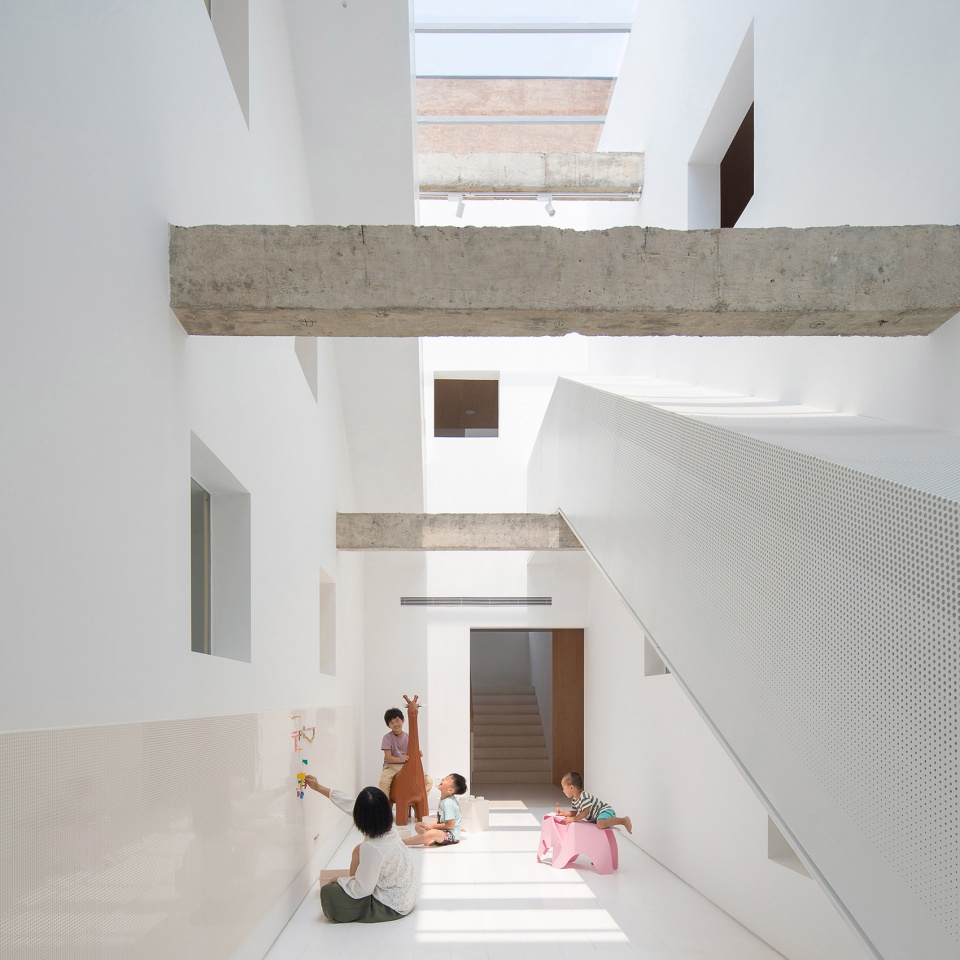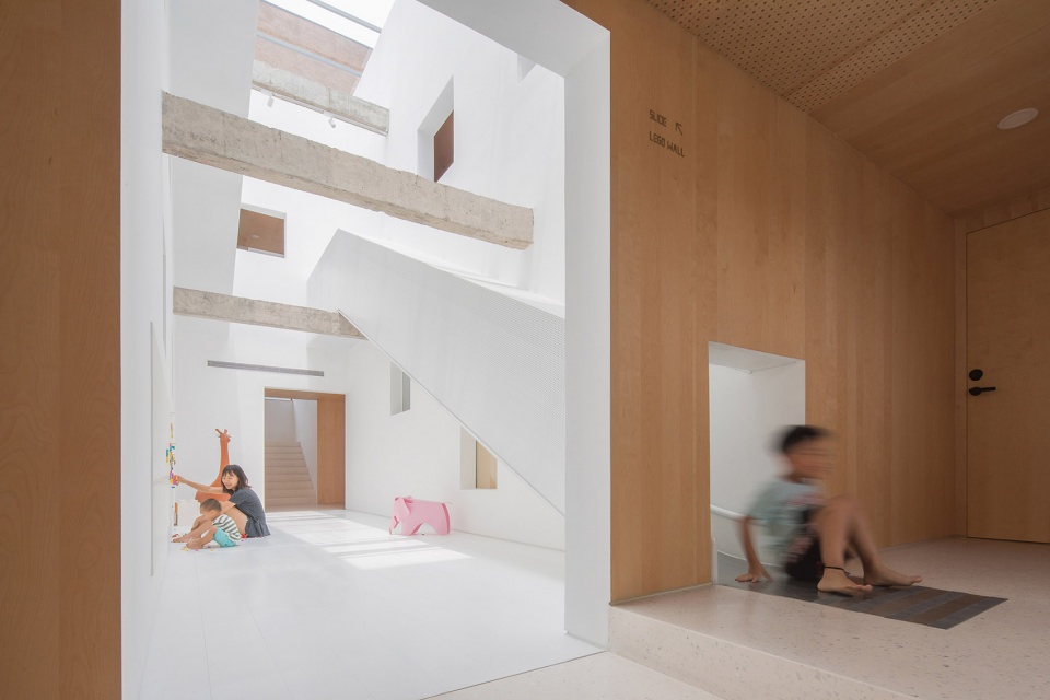 垂直方向增加中庭进行联系,也改变了平面的平铺直叙。原本黑暗的走廊变成空间的核心,在光线洒下来的那一刻所有人都很兴奋:一个竖向上毫无特质的建筑,终于展现了新的可能。借助两组长滑梯,中庭被组织成另一个动态活动中心,孩子和大人都可以快速穿梭在2-4层间,“楼梯间-走廊”构成的固定关系被打破。几个空间的划分动作同时吻合结构体系的加固原则,中间户的分割和中筒的置入,都是对结构整体性的强化。