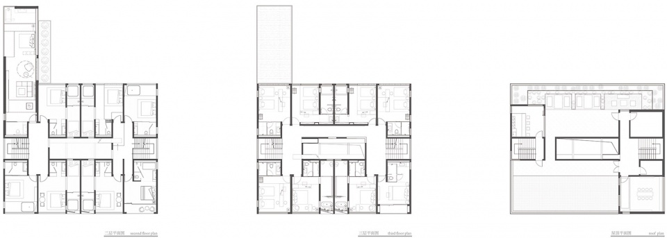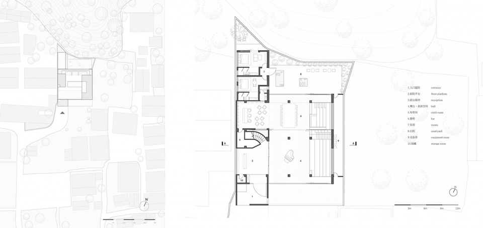 和很多其他面积冗余的自建房一样,原建筑仅首层为村民自住使用,但展现出的通透性令人印象深刻。这源于当地人对高品质居住空间的理解:充分的层高、宽敞的跨度、真材实料的混凝土框架,过大使用面积带来的低效含糊的功能划分也是奢侈感的体现。项目首层延续了室内外的模糊与通透,将前台、餐厅等服务性功能集中在西侧,最大化呈现完整开放的公共空间,设置了剧场、阅览等多种功能,并通过前厅移门和4X3米的大玻璃推拉门开合,为多种活动和未来运营提供了包容性。