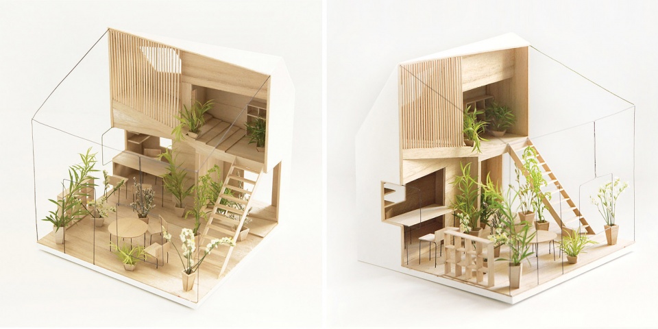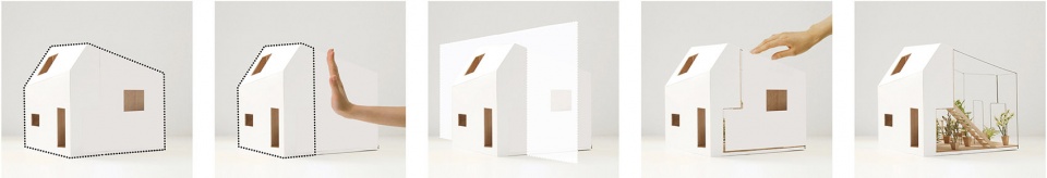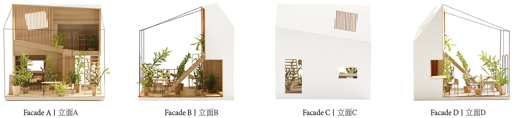 在5X5X5m的主体尺寸要求内,我们希望创造三个层次的空间感受:将“室内”压缩至1/3,整理出2/3的室外庭院,并将其中一半从屋顶挑出;人们经过被压缩的室内后忽然来到在城市尺度进行释放的绿色庭院,并进而悬浮于城市上空,小心翼翼地展开视野。