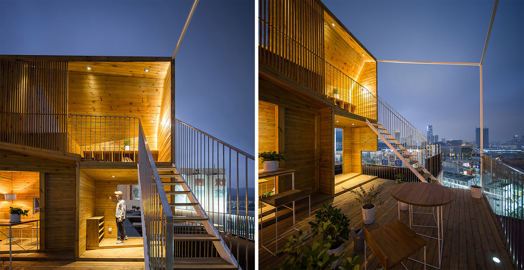 Within the required 5x5x5m structural frame, we hoped to create three levels of experience: we compressed the “indoor” to 1/3, organizing 2/3 of the outdoor courtyard, and outstretched half of it outside the roof. People pass by the compressed interior, and then suddenly get released to the green courtyard at an urban scale, before finally reaching suspension above the city and gradually expanding the view.