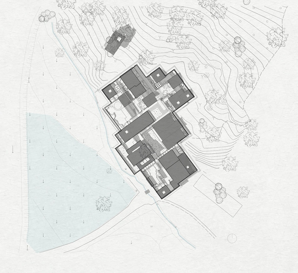 The site of this project is at the end of a rural road, while is also the beginning of the mountainous landscape. Bamboo forests, terraces, scales, elevations, mediums, and even the imaginations that stem from history, have buried many fragmented clues for the design. Through platforms, transitions and openings, the micro-building community introduced the vast mountainous countryside view into the tranquil inner courtyard.