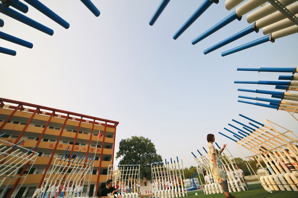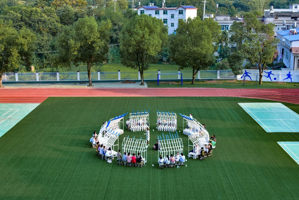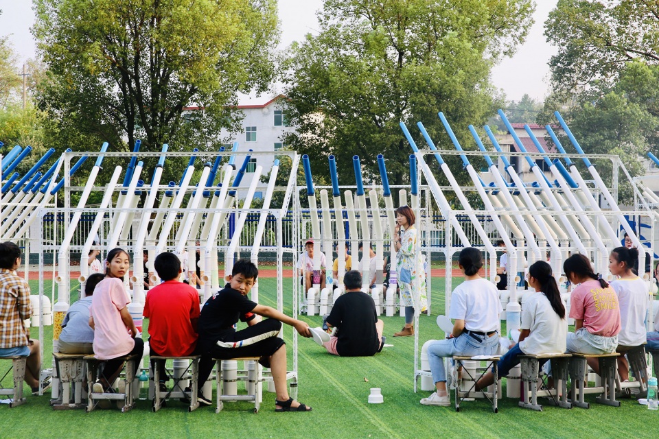 ‘Blue Daydream’ is a ‘singing space’ that designed by one take architecture and independent musician Tieyang. In the Summer Camp that organized by non-profit organization Sunners in Xishui County, Hubei Province, One Take Architects, Tieyang and Sunners, together with college volunteers and left-behind children, designed and built this spatial musical installation together, which brought the children their own “The Big Band”.