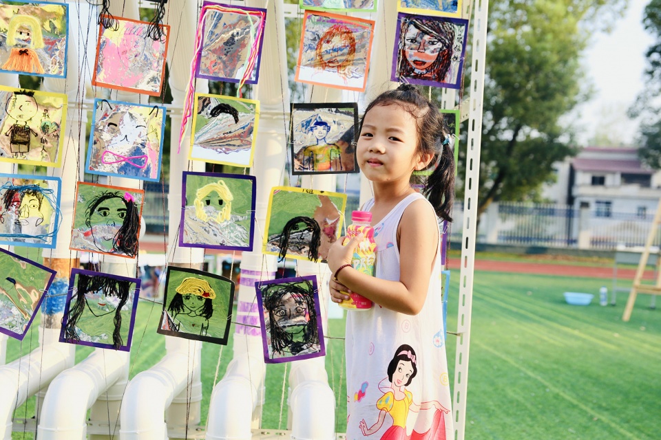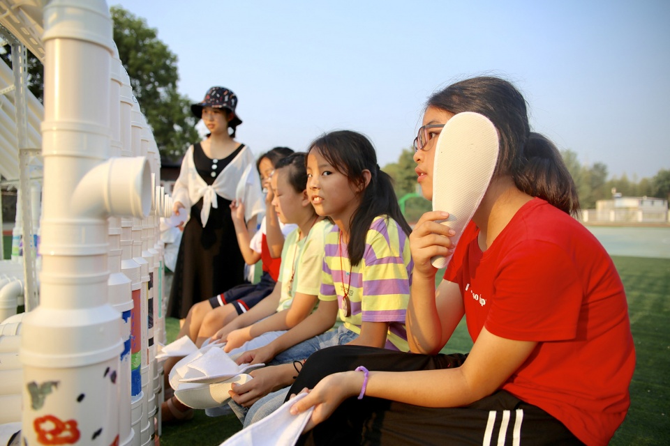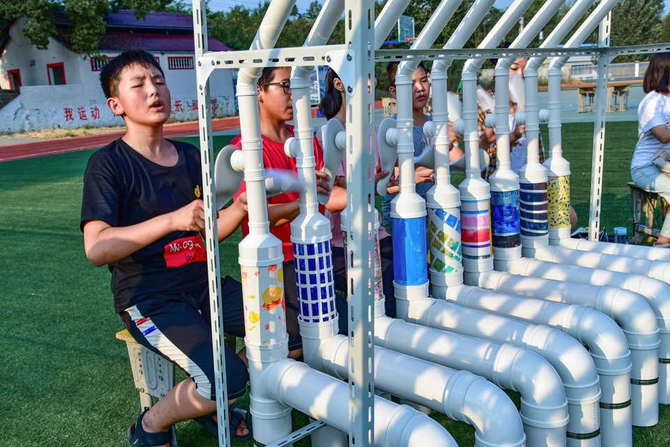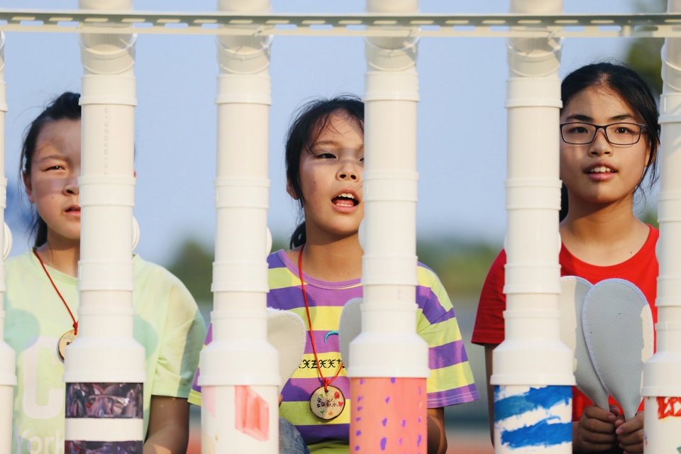 The children display “drumsticks”-disposable slippers on the stand solemnly for exhibition, together with the ukulele they made. Both the “drumsticks” and the ukulele were approved as “musical instruments” by them, which means as drumsticks the disposable slippers were given new meaning in the event of “exhibition.” Children cut and pasted the Chinese characters of ” Peach Tree Col ” using the extra mirror paper that left in the workshop, which reflected the sky and clouds; the remaining PVC pipes and connections were sorted and neatly placed in the “interactive area”, and they were assembled into a “cannon” by the children; the children drew invitations by themselves, and handed them to the old people and neighbours in the village next to the school; They were both artists and confident guides, proudly introducing their works to the villagers…