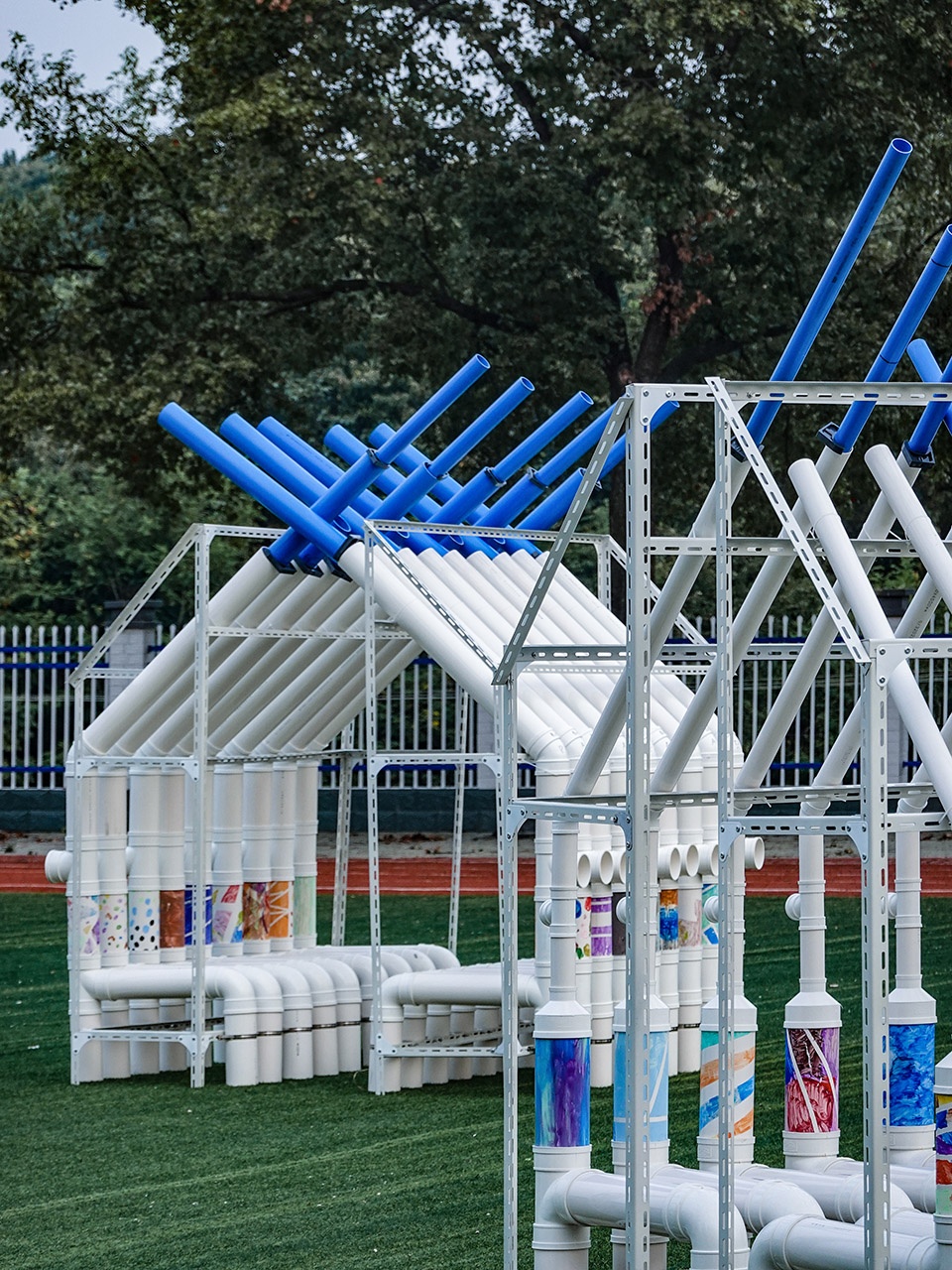 “白日梦蓝”由十组构筑物构成,分为三个声部,每个声部3-5个音阶。主要发声部位为三种不同直径的PVC排水管,并由顶部的蓝色给水管进行音高的调节。PVC给排水管在乡村及其常见——乡村里的民宅大多外露排水系统以节省造价方便检修,因此很多孩子对它们并不陌生。它们拥有极为丰富的转接配件系统,这帮助孩子们很容易地理解了原理并快速装配完成,甚至摸索更多的组合方式。