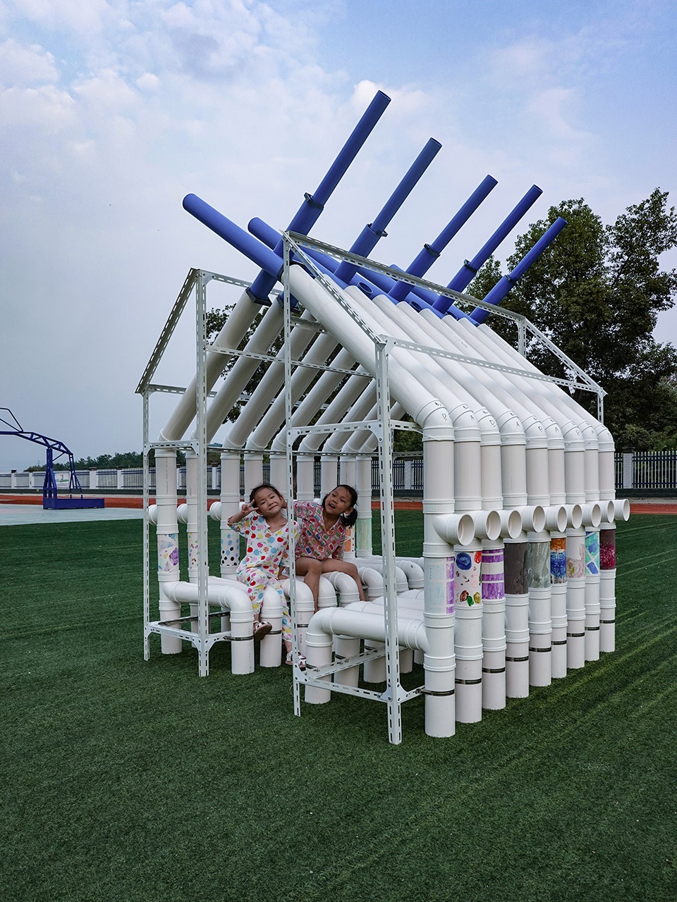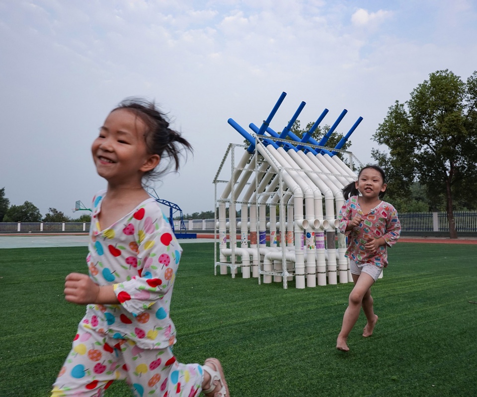 ‘Blue Daydream’ consists of 10 groups of structures divided into 3 scales of parts, and each part includes 3-5 scales. Its main sounding part is the PVC tube with three different diameters, for which the pitch of sound could be adjusted by the blue water supply pipe on the top. This kind of tube is one of the most common and accessible material/tools in the rural areas of China. To save the cost of facilitating installation and maintenance, most of the drainage systems are exposed out of the house in rural areas. Therefore, children here are pretty familiar with it in their daily life. There is a multiple and flexible system of adapters, which allows children to easily understand the assemble principle of the tubes. Thus, they could quickly assemble them, even exploring more different ways of combinations.