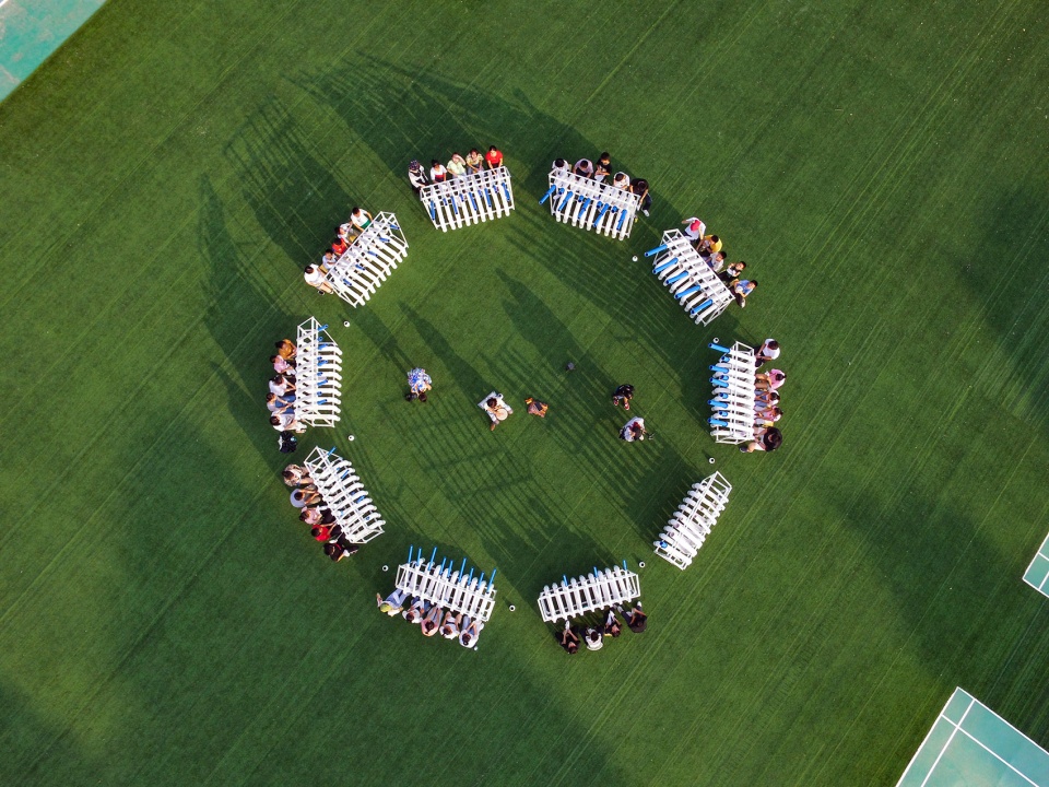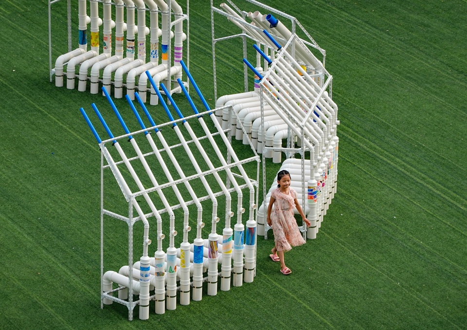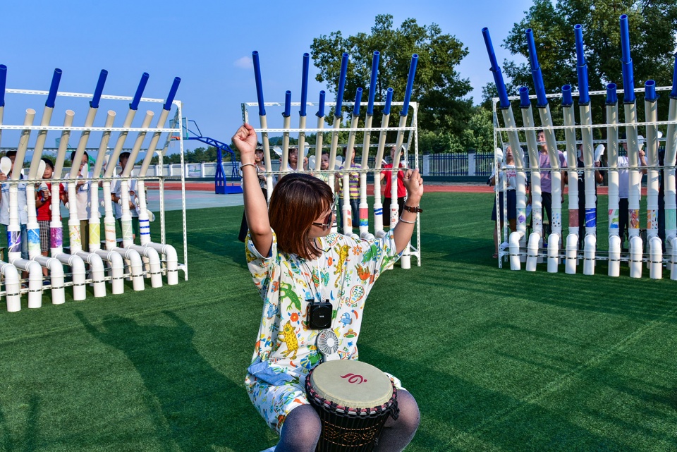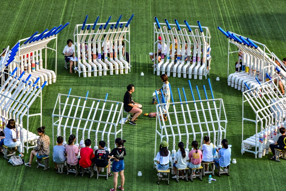 This was a space designed for children’s performances at their carnival. Ten groups of structures formed a circle, the children sat in a row on the periphery, each person taps two tubes, and the musician Tie Yang conducts the performance in the middle: they worked together to complete a performance of “WE WILL ROCK YOU”. After that, the children of the theatre camp entered the centre of the circular space, and the rest of the children sat in a circle on the stools of Daydream Blue: made it a typical “Amphitheatre”, which is the original prototype of the theatre.