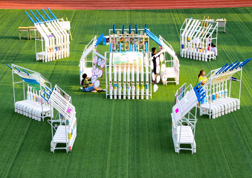 In order to simplify the construction process, the basement of the Blue Daydream is designed to be uniform sized stools that consisted of 100- millimetre-diameter PVC pipes. At the same time, the 110mm diameter PVC pipe is also a “picture scroll” for the children—they created their own painting on the pipes according to their feelings about the music they heard, and assemble them into Daydream Blue after they finished their painting.