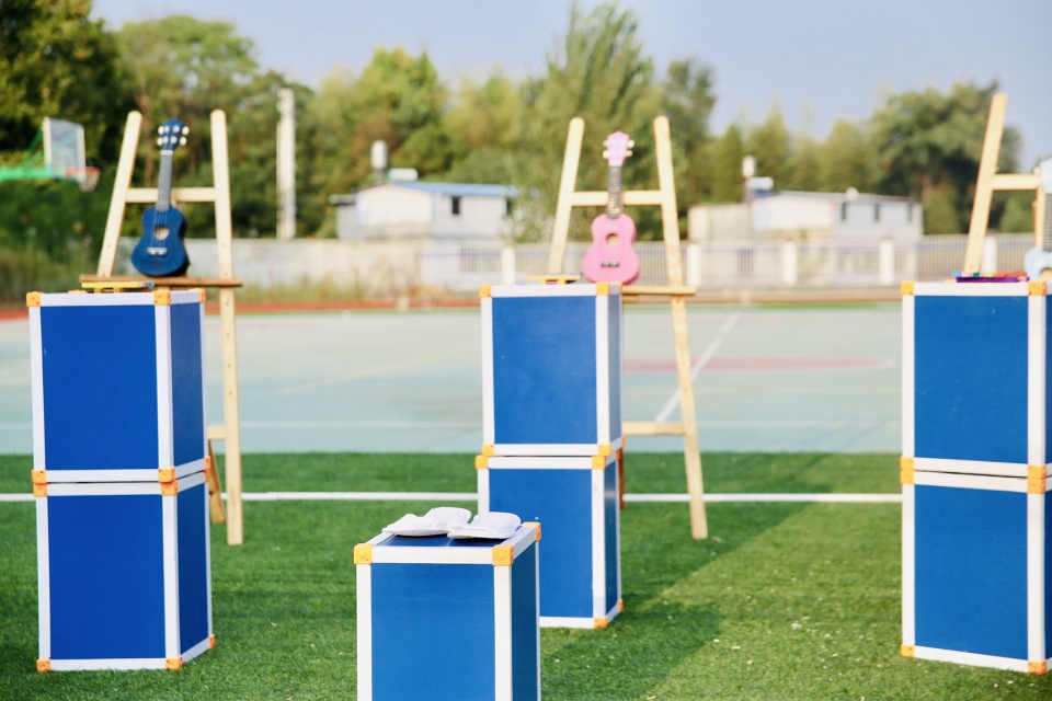 这是为孩子们在嘉年华的表演而设计的空间。十组构筑物围合成一个圆形,建造营和音乐营的孩子们在外围坐一排,每个人敲击两组,音乐人铁阳在中间指挥,完成一首“WE WILL ROCK YOU“的演奏;之后戏剧营的孩子们进入剧场中央,其余的孩子们在白日梦蓝的凳子上围坐一圈白日梦蓝成为一座典型的“圆形剧场”,而这正是剧场建筑最初的形式原型。