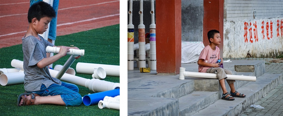 原计划与音乐营合并的课程,在中间一天由于时间表临时调整而出现了空缺。孩子们对PVC给排水管的设计与组装跃跃欲试,于是建筑师团队决定加入一个新的环节——一场可自行打造“装备”的球赛。
