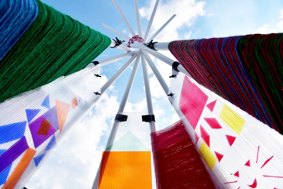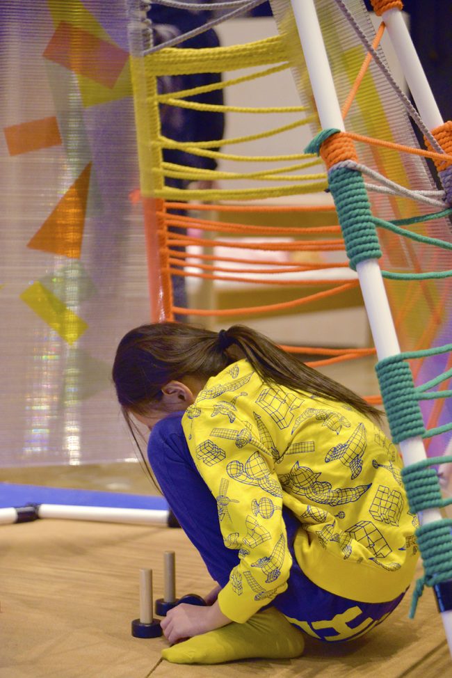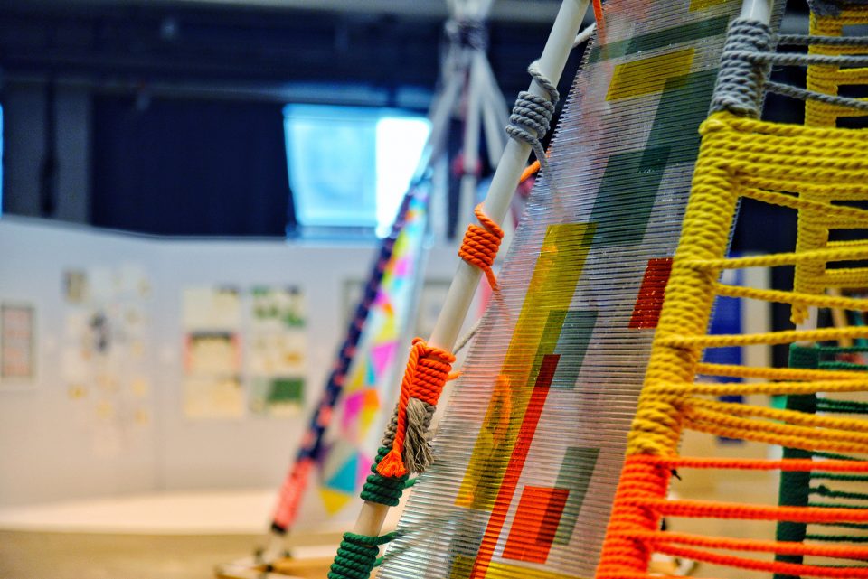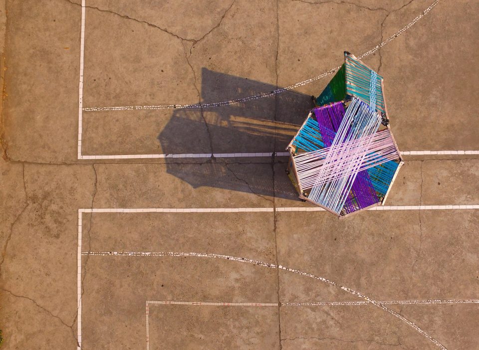 在恩施的建造营,我们为孩子们的建造设立了基础规则:每组以共计16根柔性钢管建造一个八棱锥型的小房子,孩子们可以完全自己动手建造,保证了完全的参与度与安全性,即使某些构件搭接不够紧密也不会影响整体结构稳定性;若干组小房子自由组合,形成原始聚落空间形态。在结构搭建完成后,阳光板和麻绳给了孩子们更完全的创作自由。麻绳发展出了无数种缠绕方法,带来了极为丰富的空间围合度;阳光板上的彩色拼贴让剪刀成为了孩子们的画笔,利落的剪刀径直剪向或完整或细碎的色彩,色块交迭后愈加丰富的色彩成为了阳光下颜色的游戏。