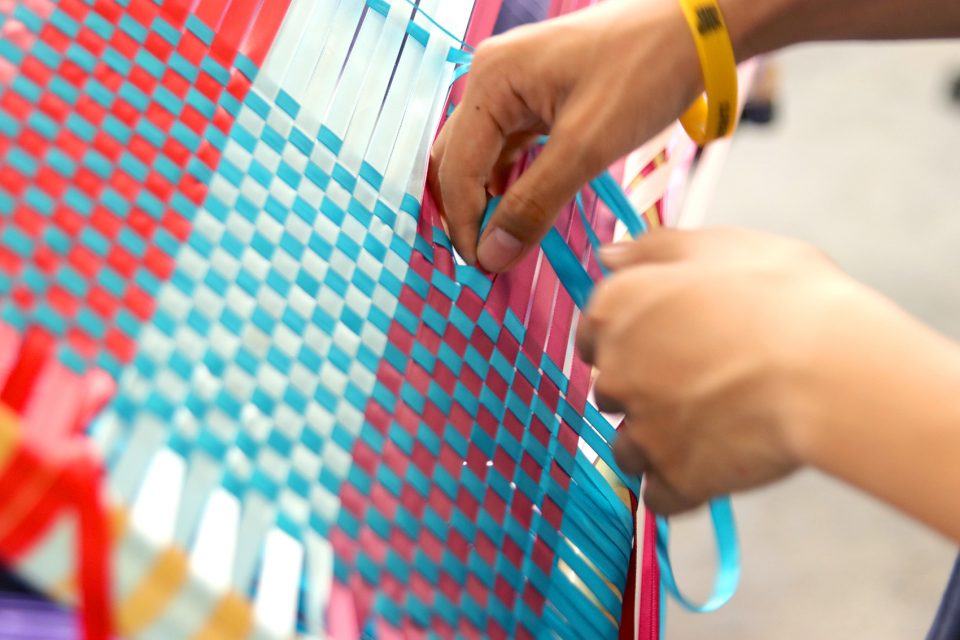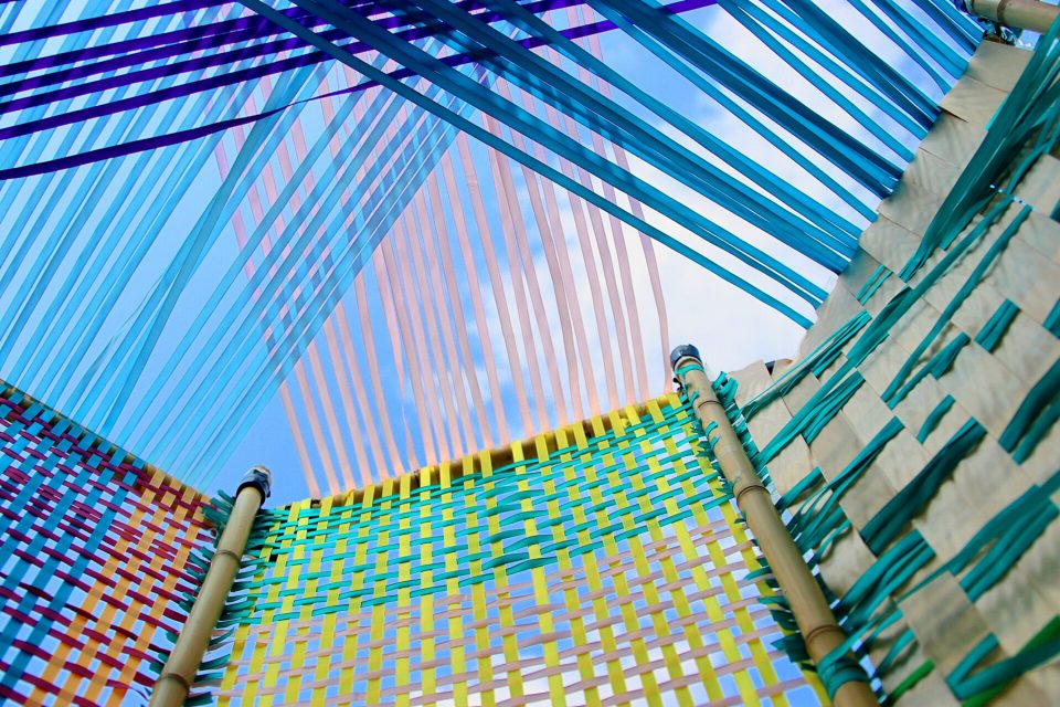 In Enshi camp, we set some basic rules: every group can use 16 lean tubes to build a shelter in an octahedral pyramid form. The children can complete it all by themselves. Even if some connection components may not be structured well, the stabilities of the whole structure will not be affected. Moreover, these shelters could be assorted independently, making a spatial form of settlement. After the main structure finished, the children could try whatever they want to create their own shape by using the polycarbonate hollow sheet and hemp rope as decoration and enclosure, forming amazing variety of space closures. By regard Polycarbonate hollow sheet as canvas, ticker tapes as pigment and scissor as pen, the children were just like playing a game of colors in the sunshine.