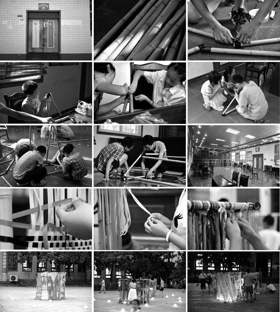 在仪陇的建造营,为适应更高年龄的孩子,并减少运输带来的成本,我们以更为轻质的竹子配合柔性管体系的预制构件,每组以共计36根竹子建造一个更为复杂的形体。从通常的角度来看,这些作品很难称之为“建筑“,它们当然不能住人,没有明确的功能,也不能够遮风挡雨。但是,在创作的六天时间里,孩子们出色完成了个建筑师的任务:接到设计任务,明确基地条件与设计要求,用草图和概述提出自己的想法,并最终依靠团队的力量完成搭建。