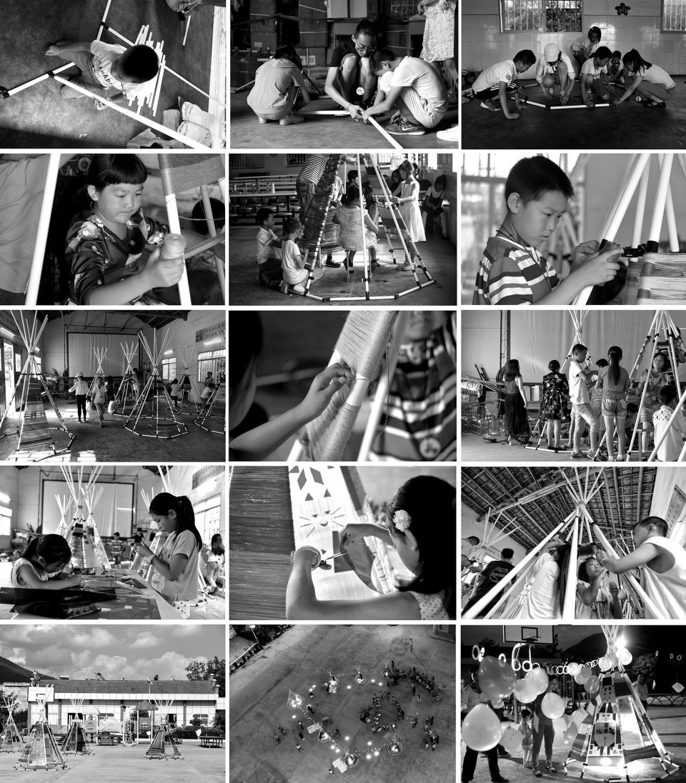 Initially, we have considered to use volunteers’ work as an example to direct the children, but we changed our mind when the camp started. Having no ‘understanding’ or ‘communicating’ issues , all the children have finished the work perfectly at twice the speed that we expected. Five-day intense creation work gave a chance for children to build their own space installation, which was a meaningful practice even most adults may never have experienced. During the camp, even people living far away from school inquired about those six shelters: ‘Is that true? Our children will build six houses?’ We felt so pride and joyful, not only for the camp becoming a big thing in the small village, but children becoming central character. In the summer camp, they are ‘On Site’!