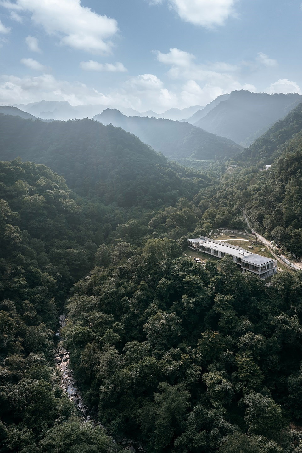 LONE-M HOTEL · QINLING is located in the foothills of the Qinling Mountains near Liuba, Shaanxi province of China. This incredible site is directly facing a large forest cliff, as if it was becoming a deliberate cross-section of Qinling. The site area for the project is 3906 square meters, and the building area is 800 square meters, consisting a cafe, 8 guest-rooms and suites, and a viewing roof platform. The architect Shanshan Qi intends to establish both a subtle but bold relationship between the building and the site: the building is lifted slightly above the articulating landscape, and adjusts its volumes carefully to views; at the same time, the architecture creates a set of orthogonal strategies reacting to the particular visual and circulatory flow on site, and sets itself parallel-ly against the direction of the facing cliff. The building itself rides on the airflow between the cliffs, like a cabin about to take off.