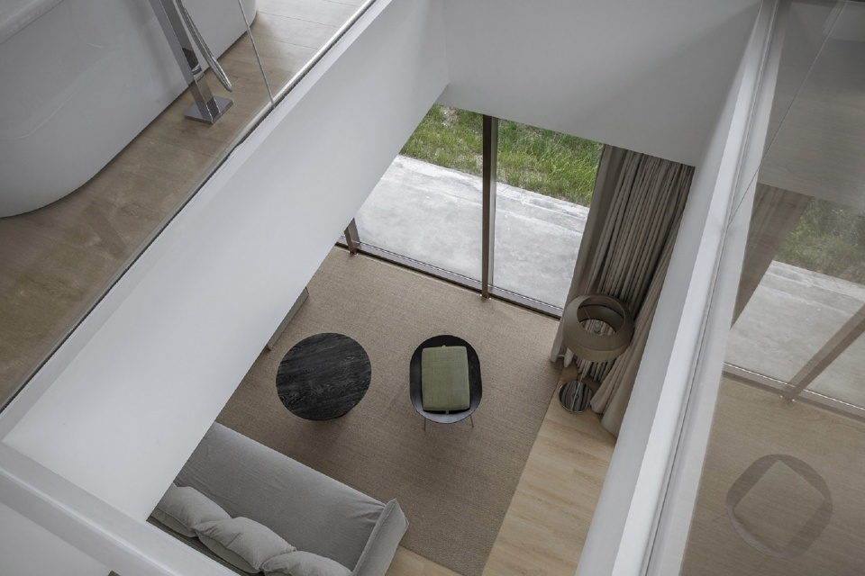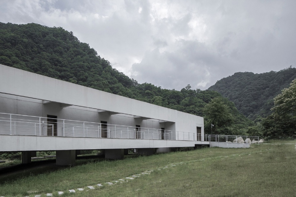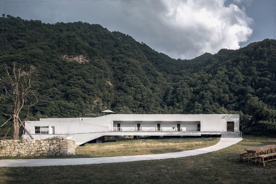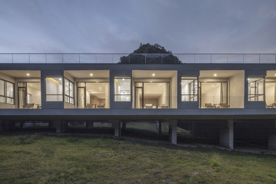 In the concrete architectural thinking, first of all, the architect makes the meadow of the site present a continuous landscape through the way of overhead on the ground floor, and the airflow can flow around the building without being cut off by the building; Secondly, the open patio space in front of the guest room door connects the surrounding meadows and divides the building into small volumes, which makes the building light and reduces the blocking sense of the building to the site.