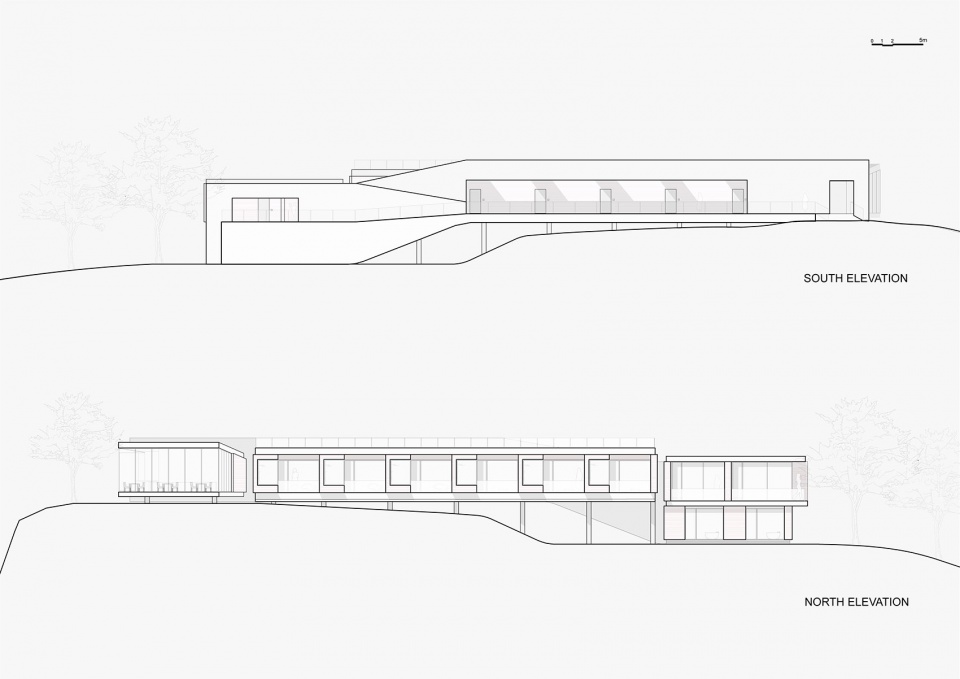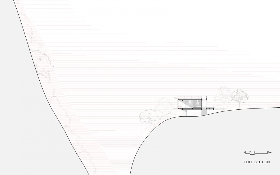 建筑与场地借助“气流”的概念建立了一种轻质的联结。建筑彷佛停留的舱体,被流动于悬崖和山体间的气流微微托起。