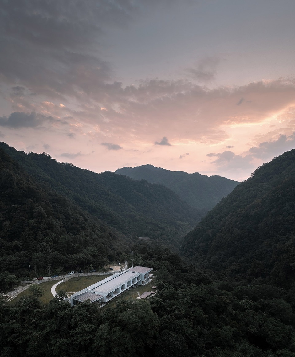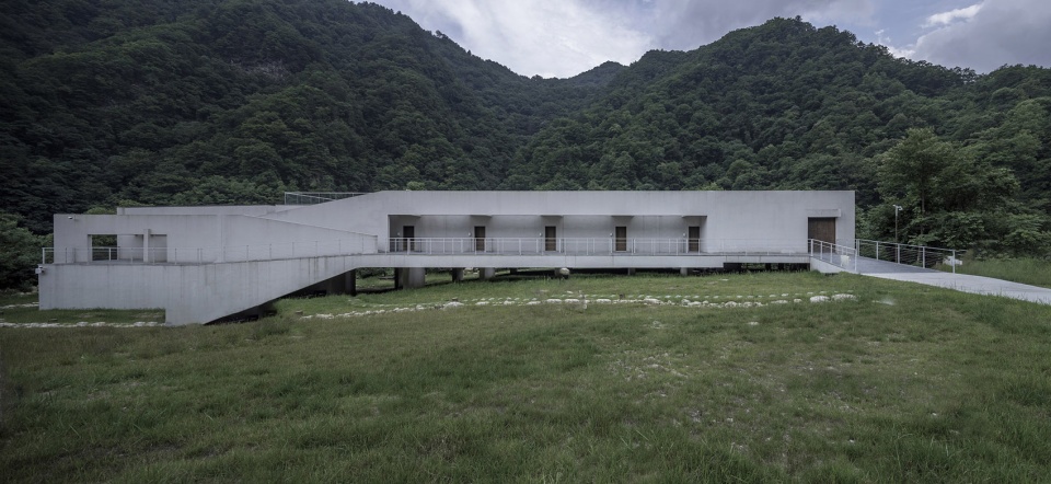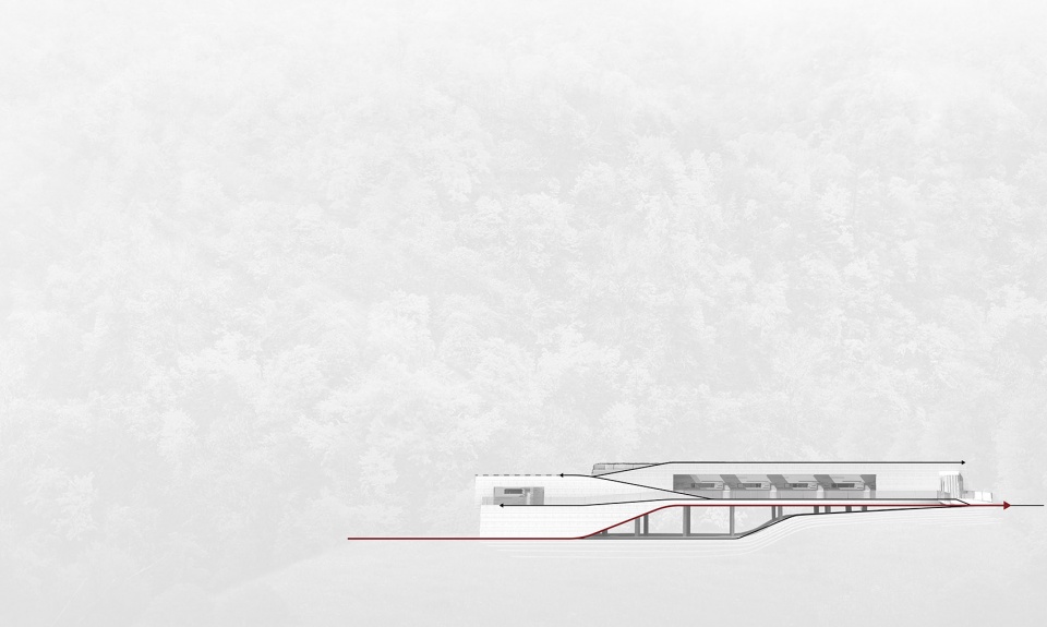 With the concept of "air flow", the building and site establish a lightweight connection. The building is like a cabin that stays, slightly supported by the airflow flowing between the cliff and the mountain.