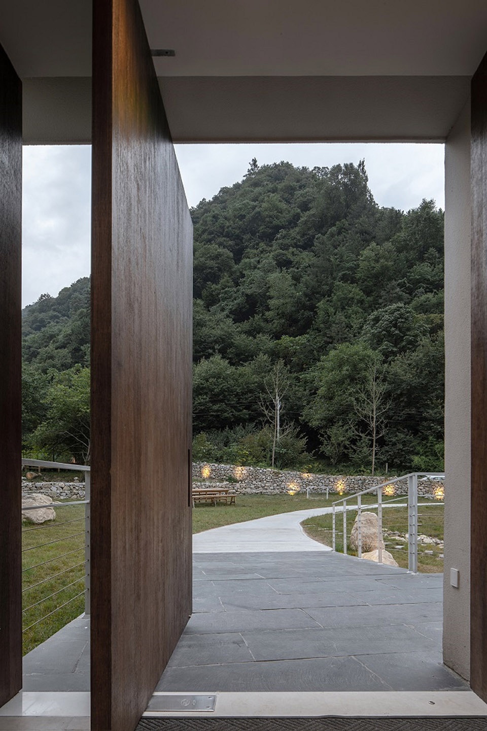 在连续的视觉线索设计中,视线从山路开始望向无尽的秦岭,至平行于山崖的建筑被阻挡,视线在微妙变化的路径中经由斜桥、公区、悬桥、短桥、玄关、起居、卧房终至阳台,在阳台驻足,视线线索正是成为行为的引导,将不同属性的若干层空间联结起来。人在山路行走望见被轻轻抬高的「空山九帖」,能看见草甸延续至建筑后方,后方的景色却被建筑控制和遮掩。进入客房,能够看见藏身于玄关一隅的秦岭框景,引导人向前探索。移步阳台,隔岸的山林与山脉再无遮挡的显现于面前。视野彷佛可以随着山势向上移动,至天空与山的交界处。视野的骤变为人带来强烈的情感冲击,使人从现实时空瞬移到秦岭猿鸣遍山的古境,沉浸于秦岭静寂而广袤的山脉中。