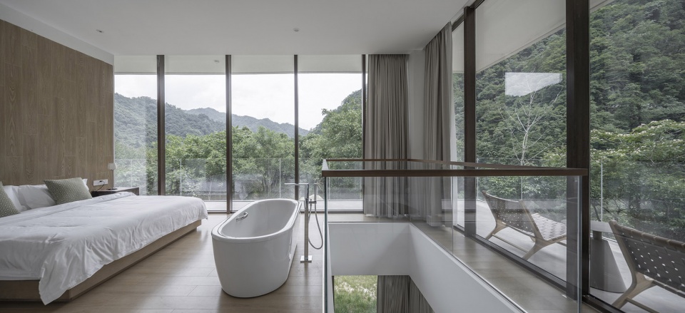 In the guest room system of "Nine Ties in the Empty Mountains · Qinling Mountains", the bathroom and the main living area are parallel and juxtaposed in the X axis, and the internal functions are arranged in the Y axis. The square bathtub is located at the front of the landscape and connected with the open balcony, outlining two kinds of posture of lying and watching the landscape. At this time, the relaxing feeling brought by bathing becomes a part of the viewing experience, and the bathing surrounded by lush mountains and forests also constitutes a unique residential experience, providing people with a wild texture similar to outdoor bathing. The section of the Qinling Mountains, which is almost unobstructed by the sight, comes to us. Here we breathe the clear water of the forest, listen to the pulse of the Qinling Mountains, and enjoy the incomparable front view of the Qinling Mountains.