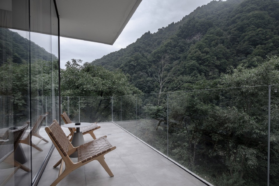 Spatial sequence from large scene to small scene. From the winding mountain road in front of the "Empty Mountain Jiutie Qinling" to the balcony facing the mountains on the other side of the building, there is a continuous and ceremonial walking experience along this group of space streamline. The mountain road in front of the building is located in the Qinling Mountains, and the grand mountains pour down from both sides of the mountain road. The scene is grand and the pedestrians are small. When you follow the mountain road to the building veranda, a short bridge is framed by a concrete slab, connecting the guest room and the veranda. The suspended slab and short bridge form a different space experience from the mountain path: stepping into the suspension bridge parallel to the main body of the building, the human body turns 90 degrees, the body is clamped by the suspension bridge and the independent wall structure, the space dimension shrinks laterally, and the depth of field extends along the trend, forming the unique outdoor porch system of the "Empty Mountain and Nine Ties". The suspension bridge corridor and the main body of the guest room are separated again by the placement of the short bridge and the patio, thus reconstructing the spatial cognition of the in-home experience. Through the short bridge, the foot turns 90 degrees again. After a ray of sunlight scattered into the courtyard, the guests enter the hallway. After officially entering the indoor scene, the spatial dimension is shrunk again. When passing through the living room, bedroom, and balcony, the section of the Qinling Mountains is gradually enlarged and stretched across the eyes, the person's state in the vast nature reappears again, and returns to the care of the mountains and rivers with a complete state of mind. The spatial sequence of "Nine Ties of the Empty Mountain · Qinling Mountains" creates a field transformation from grand to subtle and then to grand, giving people an absolute and physical experience of Qinling Mountains.