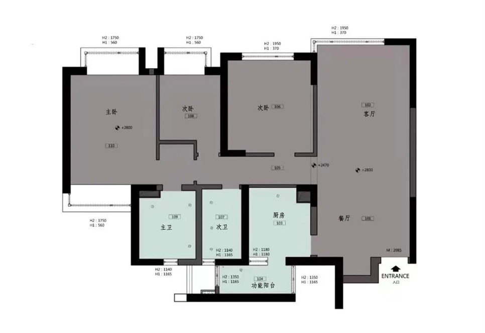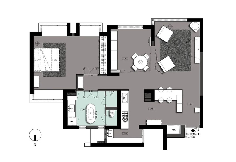 主卧与次卧合二为一,主卫次卫合二为一, 让单个功能区拥有更富裕的空间尺度。