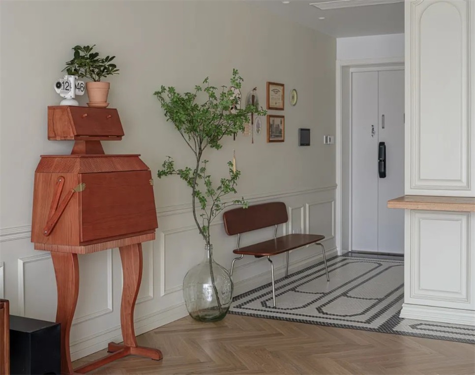 The entrance cabinet is added to make it convenient to change clothes and shoes at home. The high cabinet and connecting bar also form a privacy protection barrier.