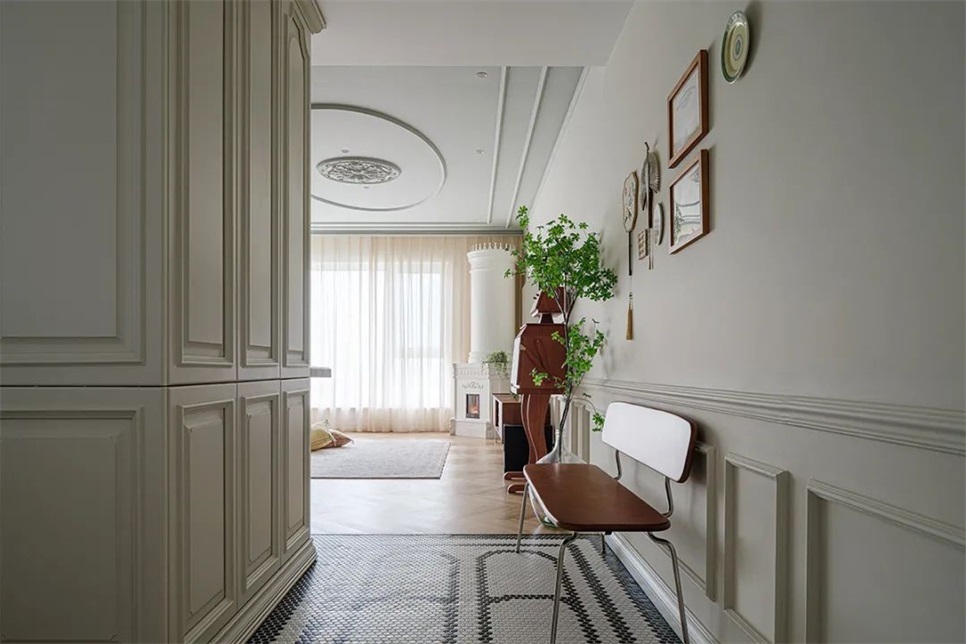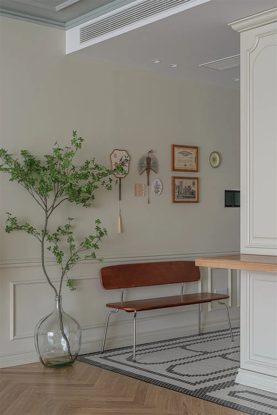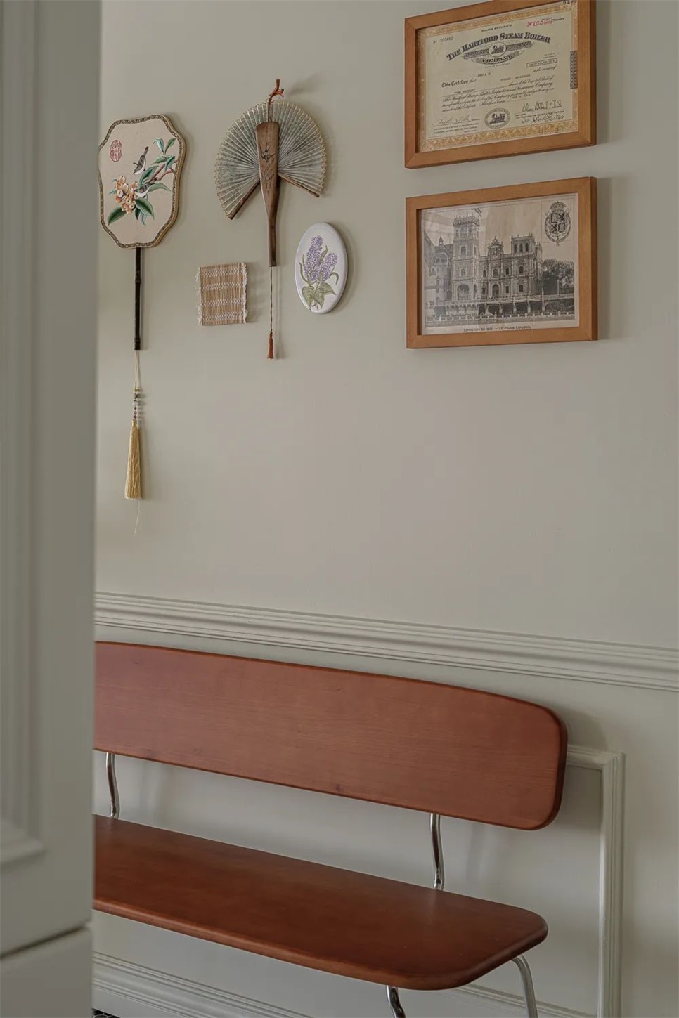 The wall on the right is made into a memory gallery, and some small commemorative objects are made into decorative paintings, so that the entry into the house has a more ceremonial feeling.